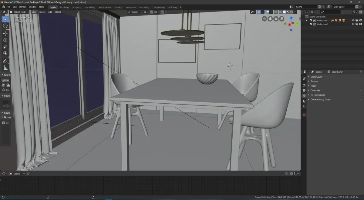 A blender made interior desing using Eevee, the scene modeled on the exact same real world dimensions, including low poly objects, was textured using 3 up to 4k textures, and the file is availble in different formats, and the scene was completely optimised so you can decrease your render time .