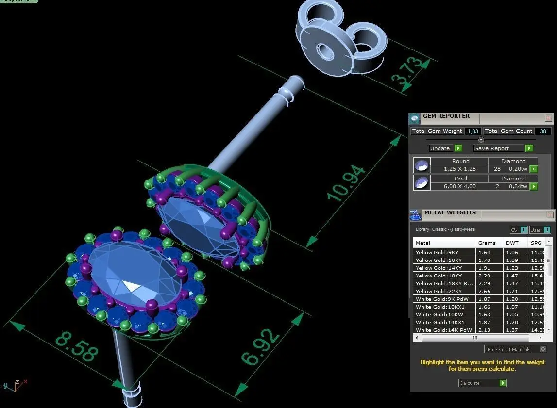 Classicl set with oval gem. 14k gold weith 2 earrings 1.9 gr. pendant 0.8 gr . gems in a pendant-oval 6x4 mm-1pc. 1.25mm-14 pc.You can see the dimensions of the model and gems on one of the photos presented here.There 3dm file for editing and stl for printing.