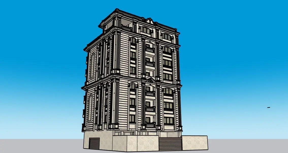 Classic Seven-Story Residential Building - 3D Model (SketchUp + AutoCAD)This is a detailed 3D model of a classic seven-story residential building including the ground floor. The architectural style is inspired by traditional classical architecture with ornate facades and realistic proportions.