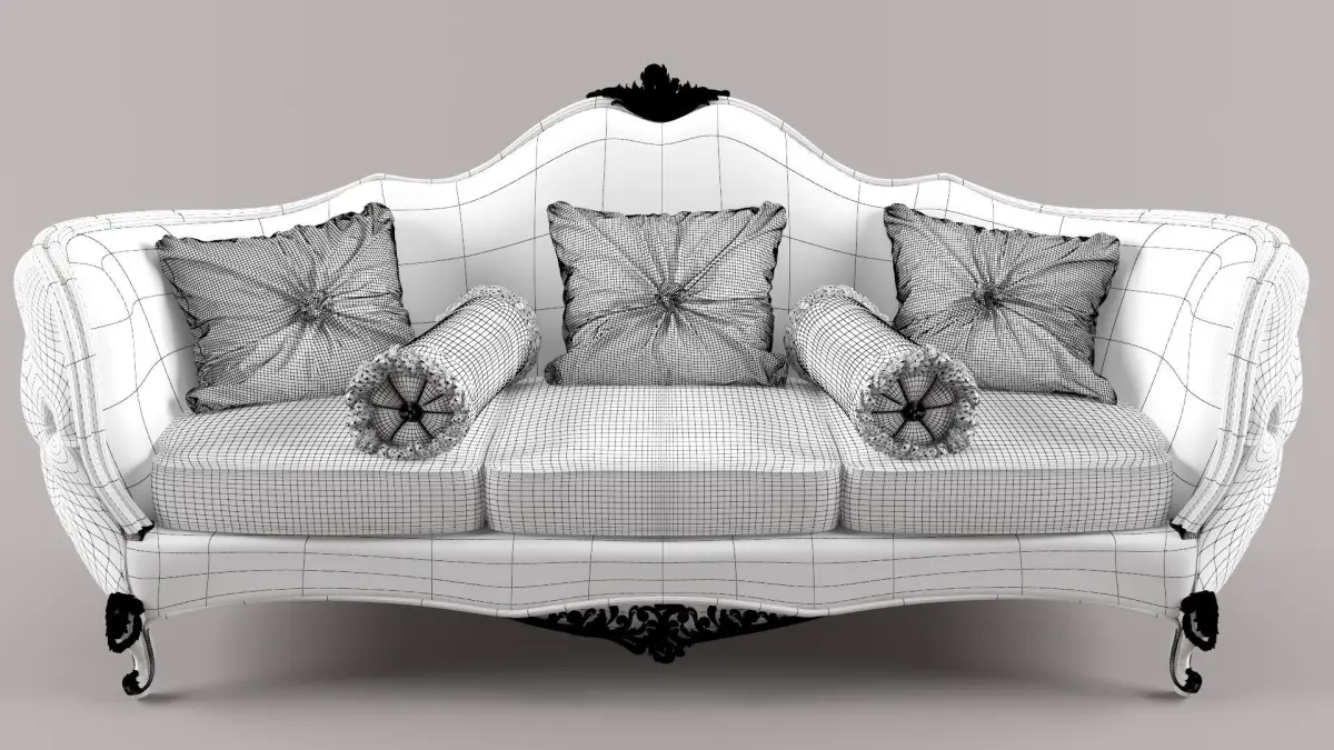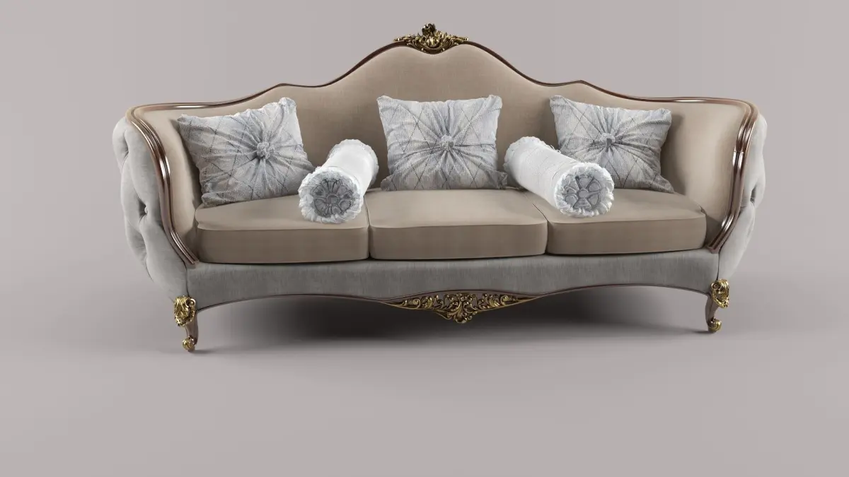 The neoclassical sofa is designed to suit most tastes. Wood trims and structure can be implemented by CNC. It is designed with true dimensions and shape suitable for industrial and other purposes.Dimensions107 cm highWidth 241 cmDepth 95 cm. Dimensions can be easily modified