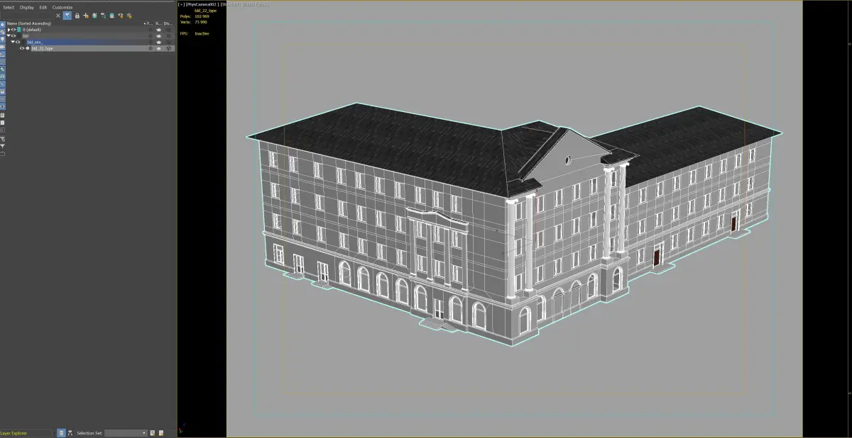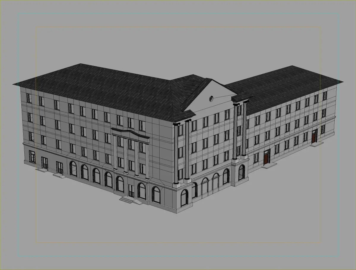 A highly detailed 3D model of a Soviet-era residential building with classical architectural elements.