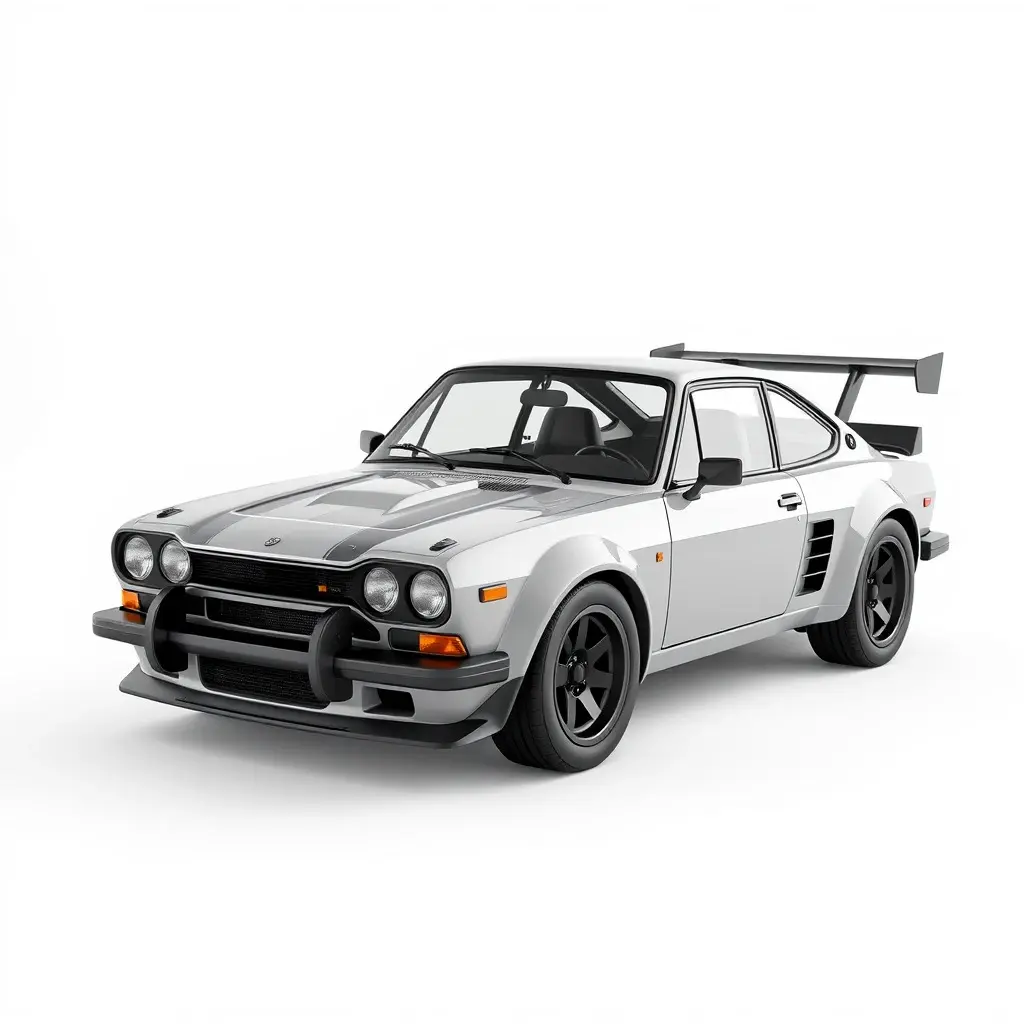 Classic sports car, Ford Escort RS1800, white body, black wheels, racing modifications, large rear spoiler, front bull bar, rally-inspired, 1970s design, aggressive stance, detailed 3D render, clean background, studio lighting, high contrast, automotive photography, vintage performance vehicle, iconic rally car