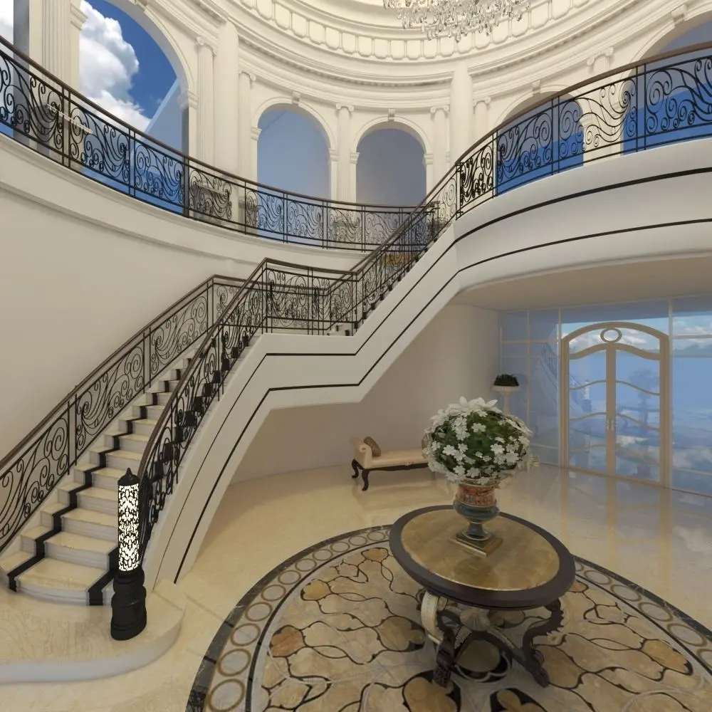 an entrance hall with a majestic classic staircase with wrought iron rails , chandeliers and a circular ionic designed arcsades .