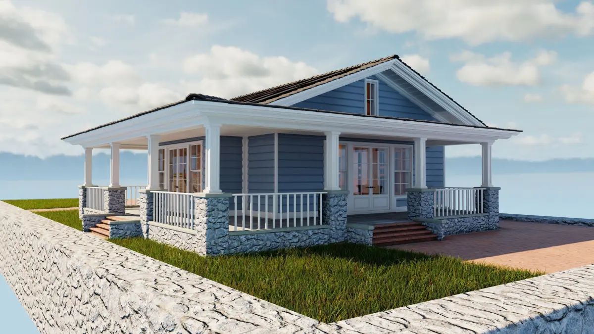 Note: The first render on this page is taken in the original house project, the trees that are visible in this render are not included, everything in the other renders is included.