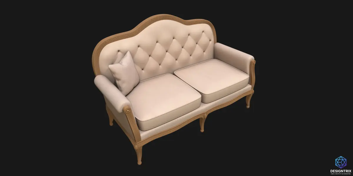 This is a 3D model of a classic-style sofa. The design features a beautifully curved wooden frame with elegant detailing along the edges and legs. The backrest is upholstered with soft, cream-colored fabric and has a tufted, buttoned pattern that adds a touch of luxury. The seat consists of two large, comfortable cushions, and there is a single white throw pillow placed on one side. The arms of the sofa are rolled, giving it a traditional and sophisticated look. Overall, this model combines comfort with a timeless, vintage design