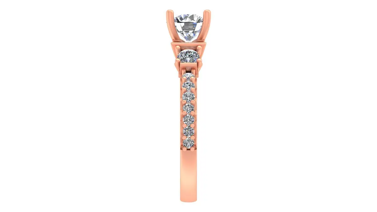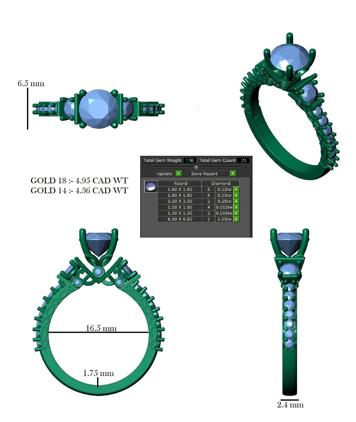 Measurements & Specifications:Top Width: 6.5 mmBand Width at Bottom: 1.75 mmSide Profile Height: 2.4 mmInner Diameter: 16.5 mmMaterial & Weight:18K Gold: 4.95 CAD WT14K Gold: 4.36 CAD WTGemstone Details:8 stones (1.60 mm round-cut, 0.12 total carat weight)8 stones (1.80 mm round-cut, 0.13 total carat weight)2 stones (3.20 mm round-cut, 0.25 total carat weight)4 stones (1.00 mm round-cut, 0.15 total carat weight)2 stones (1.30 mm round-cut, 0.016 total carat weight)1 center stone (6.5 mm round-cut, 1.03 total carat weight)This elegant engagement ring is designed for those who appreciate classic beauty with modern refinement. The three-stone setting, combined with a dazzling pave-set band, makes it a timeless piece that will be cherished for generations.