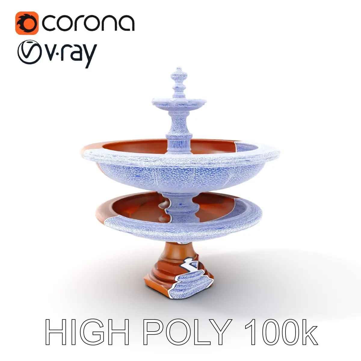 The classic tiered fountain model pack offers three levels of detail: low-poly with 1000 triangles ideal for mobile use, middle-poly with 10,000 triangles suitable for environmental integration, and high-poly with 100,000 triangles for production-quality renders. This versatility makes it perfect for uses in CG films, games (compatible with Unity and Unreal), and virtual environments.