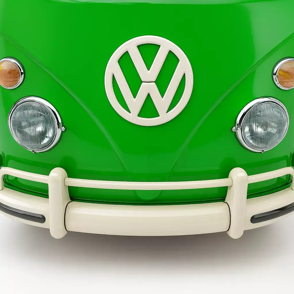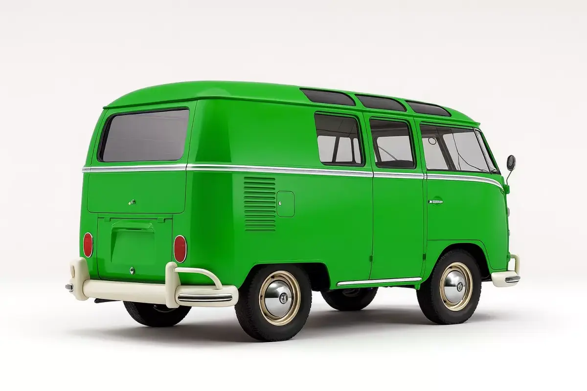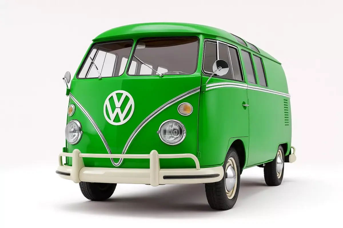 This 3D model accurately recreates a classic VW Bus T2a, produced between 1967 and 1971. The iconic vehicle is presented in a bright, cheerful green, characteristic of the era. It features the distinctive rounded roof, large windows including the split windshield, and the prominent Volkswagen logo on the front. The model includes details like the sliding side door, chrome bumpers with over riders, and retro-style wheels with chrome hubcaps. This vintage van evokes a sense of nostalgia and adventure, making it perfect for historical visualizations, rendering retro scenes, or as a charming addition to any 3D environment.