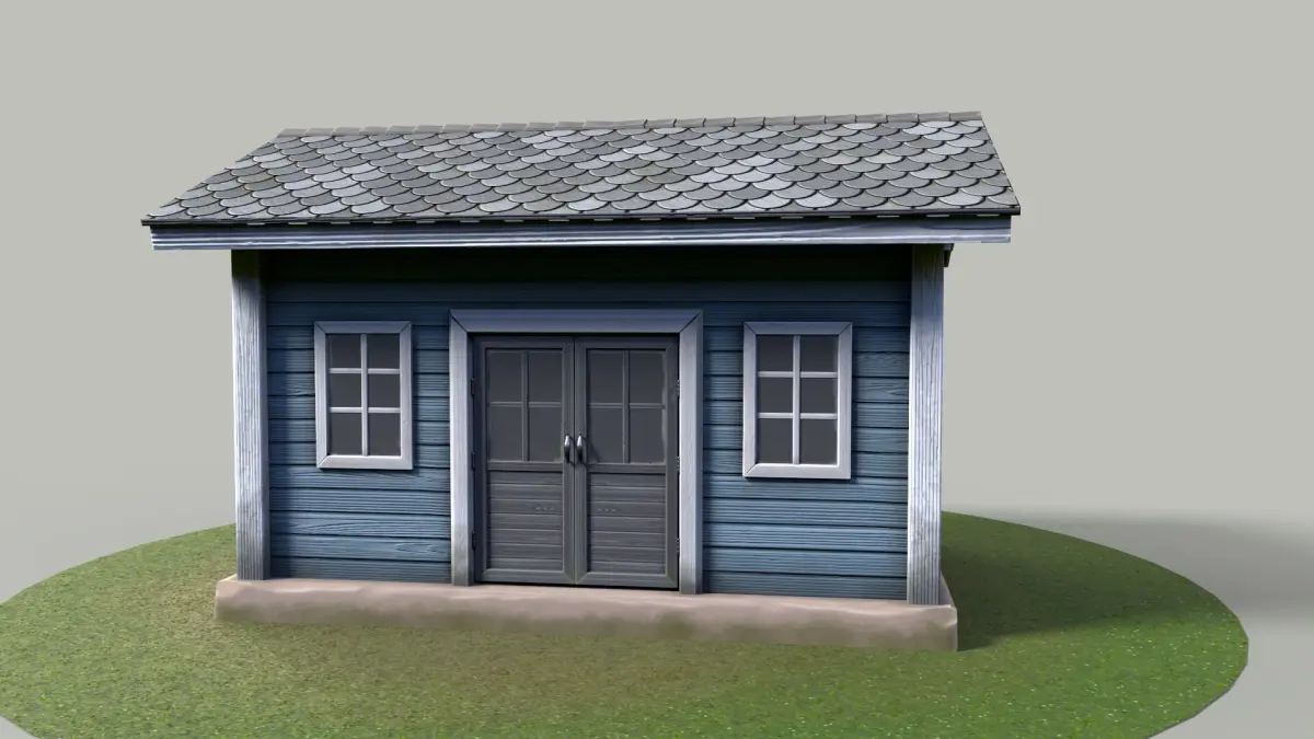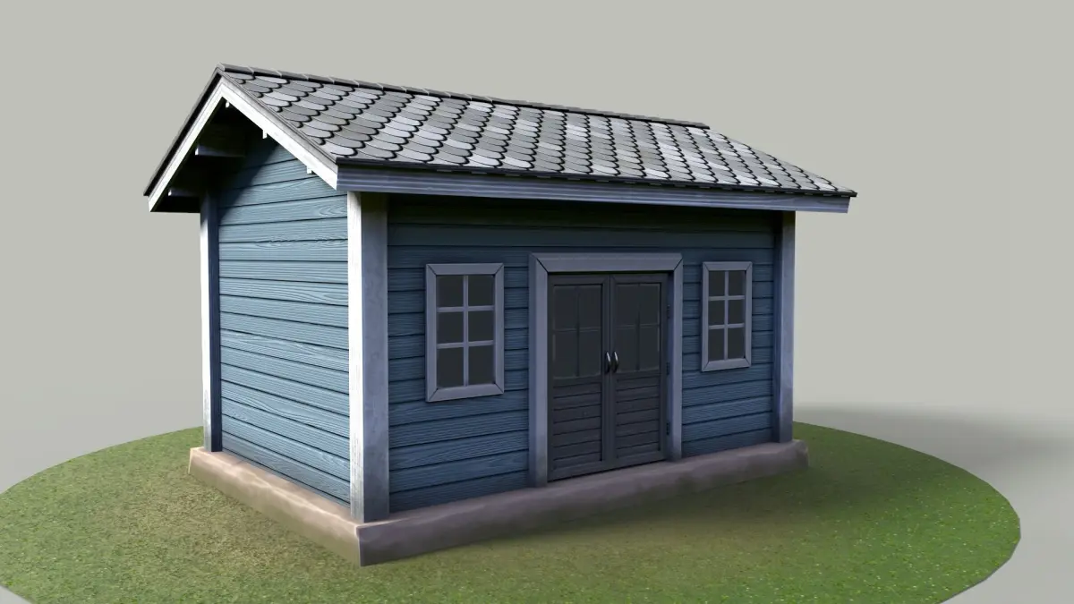 The model features realistic wood paneling, clean white window frames, a classic tiled roof, and a double-door entry, making it perfect for gardens, backyards, or rural properties.