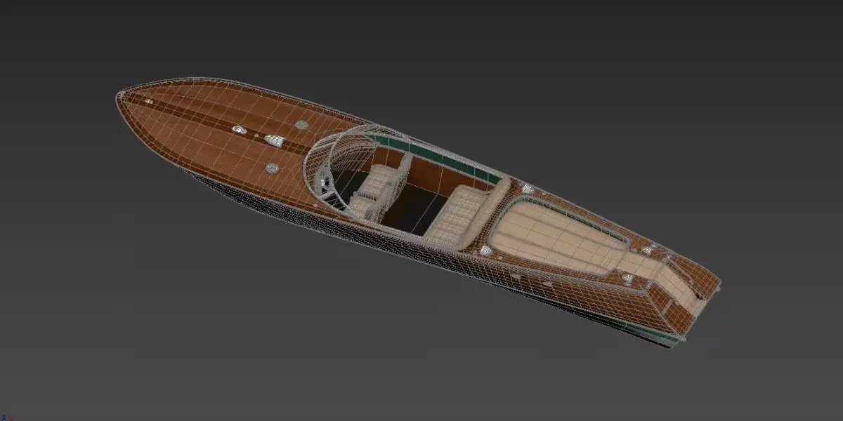 Beautifully detailed varnished wooden hull and deck with realistic grain texturesLuxurious beige leather upholstered seating for driver and passengersClassic wrap-around windshield with chrome frameDetailed helm station with wooden steering wheel and vintage gaugesRear sun pad and forward bench seating for relaxed cruising