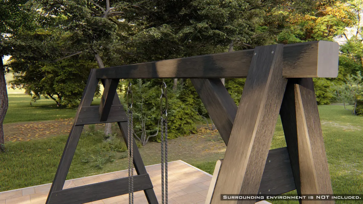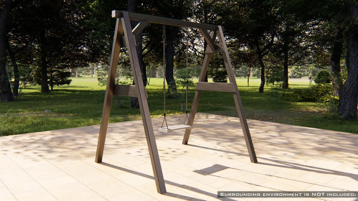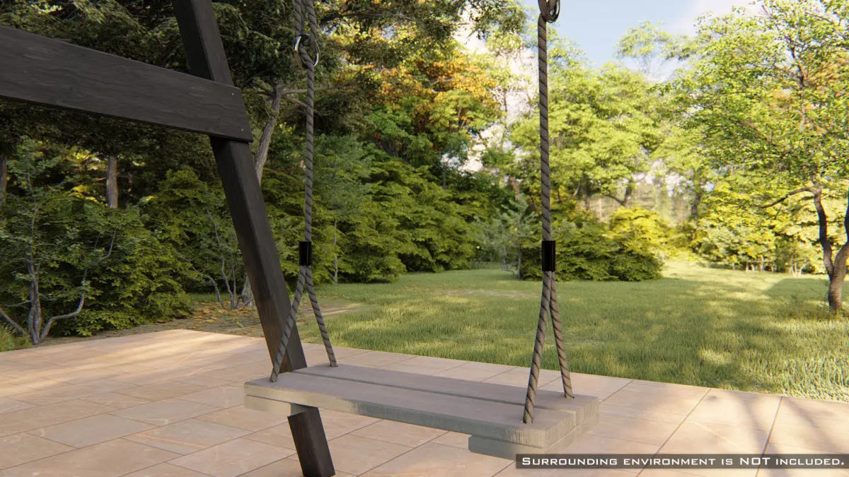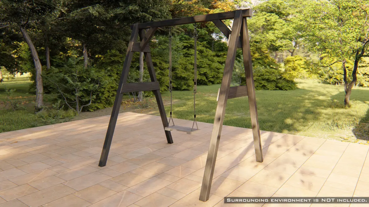 Unique high-quality 3D model of a classic wooden swing with ropes. The wooden design fits well in natural surroundings, such as a garden.