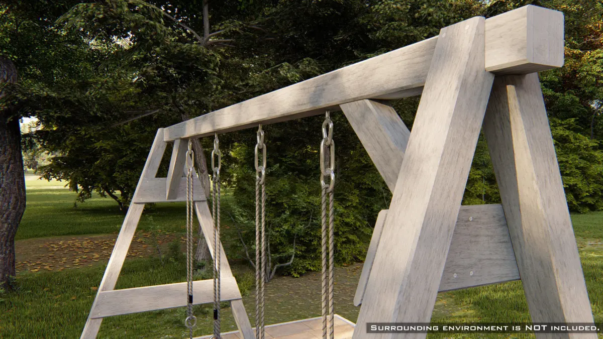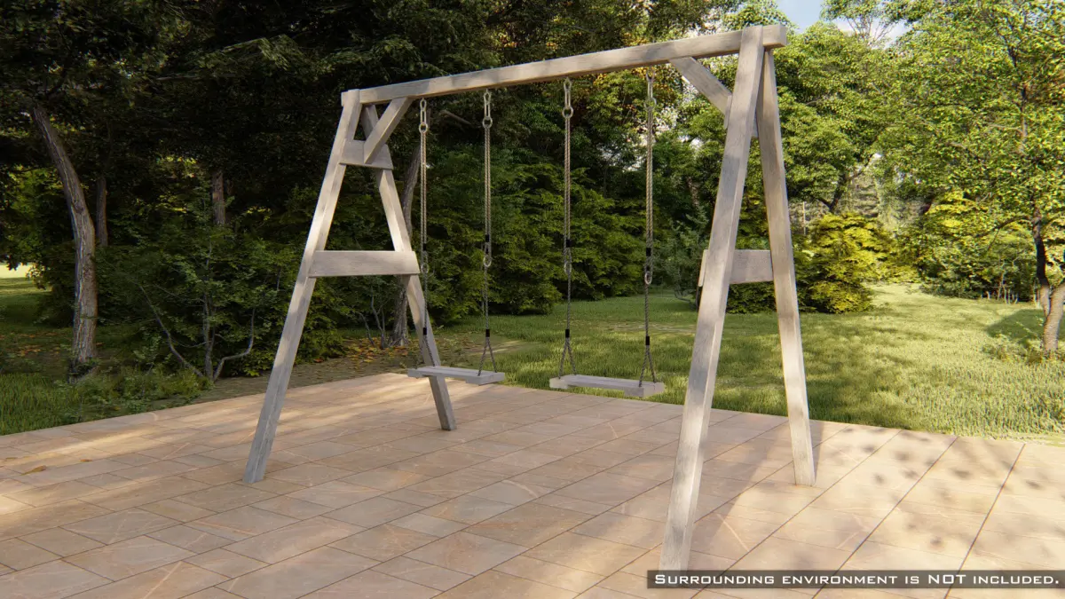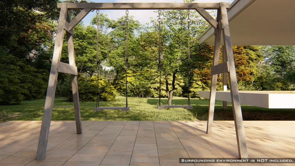 Unique high-quality 3D model of a classic wooden swing with two seats on the ropes. The wooden design fits well in natural surroundings, such as a garden.