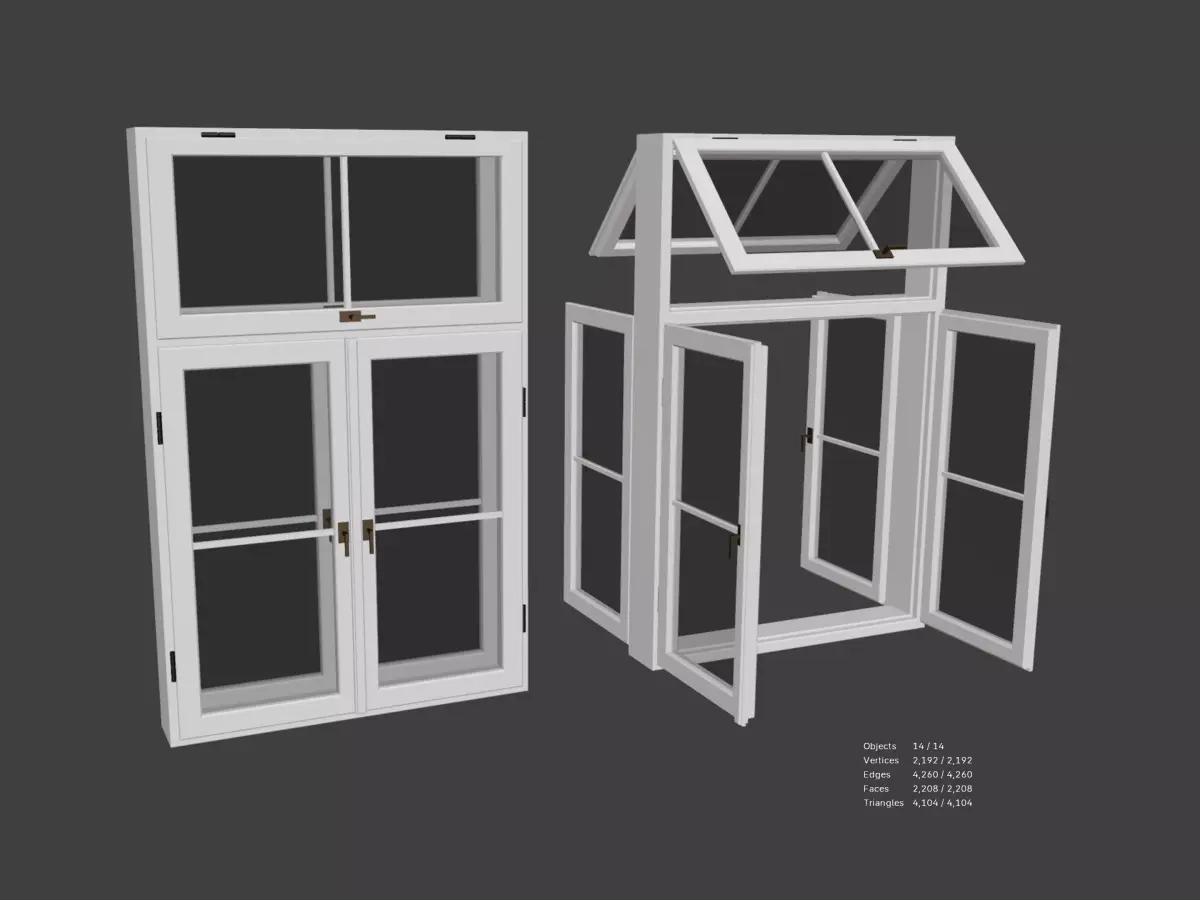 Double wooden window with 6 frames, each of which can be opened.FORMATS: .BLEND (native) .FBX .OBJ .DAE .ABC .PLY .glTF .USDC