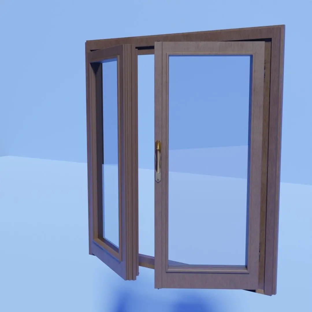 Classic wooden window with frames, brass window handle, metal hinges and glass material.