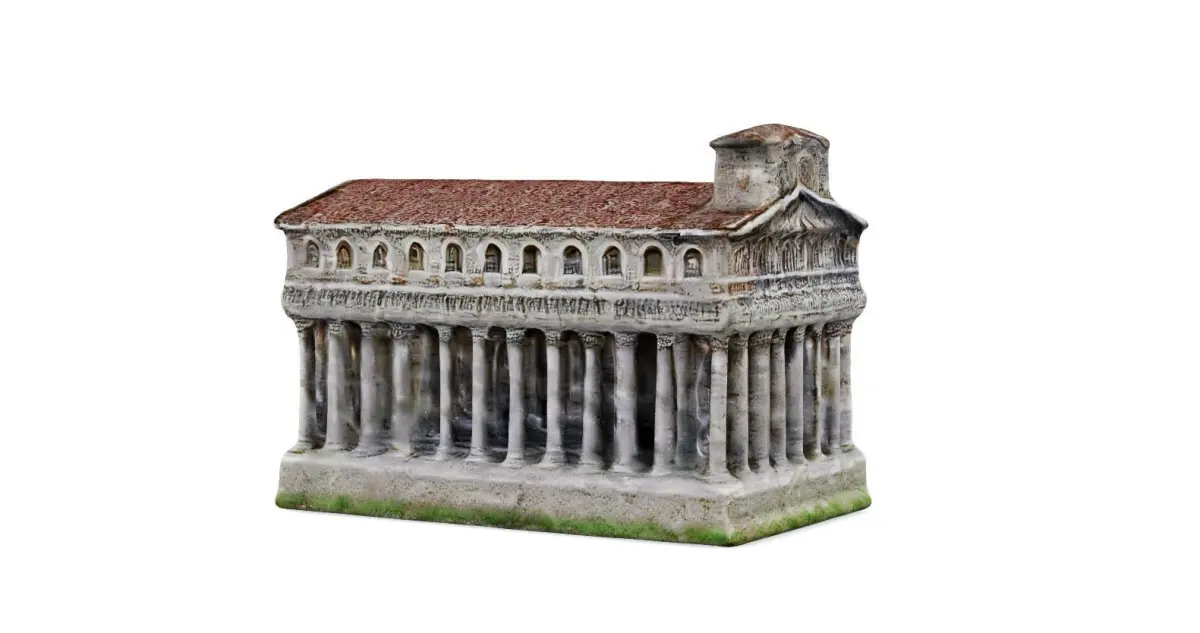 This 3D model represents a classical ancient temple, reminiscent of historical architectural styles found in ancient Rome or Greece. The intricacies of the columns, roof, and façade details have been meticulously crafted, showcasing a high level of detail that suggests a sophisticated understanding of historical architecture.
