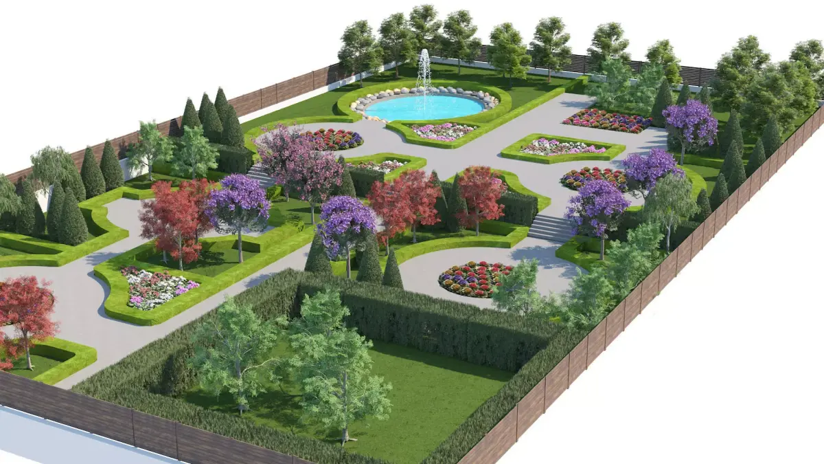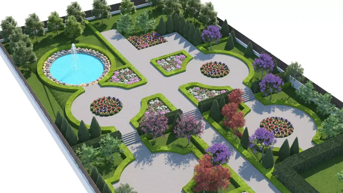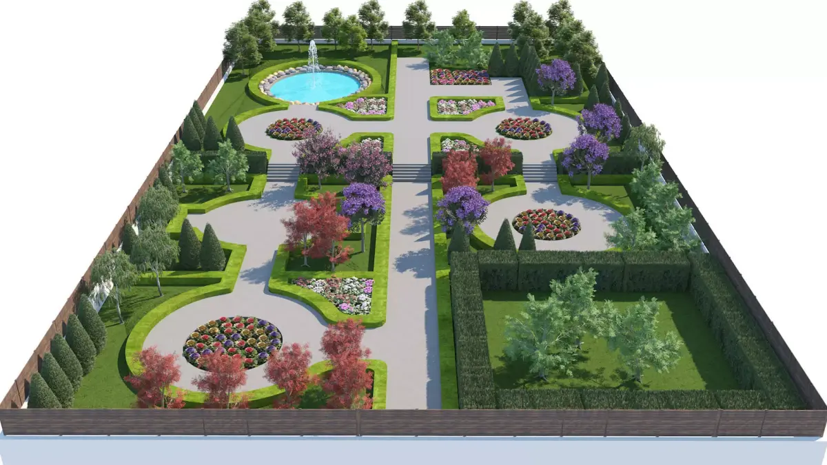 Highly Detailed Layout: Includes a structured garden design with circular plazas, geometric pathways, and ornamental flower beds.