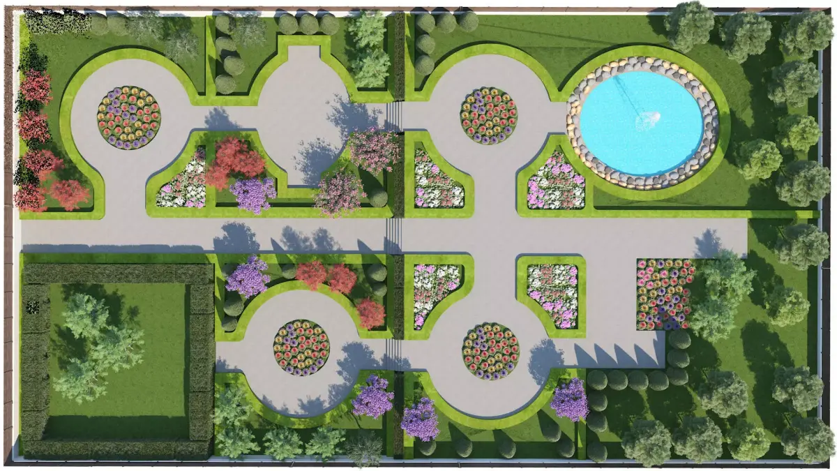Symmetrical Design: Classic formal-garden style with mirrored paths and sculpted green areas for elegant visual impact.