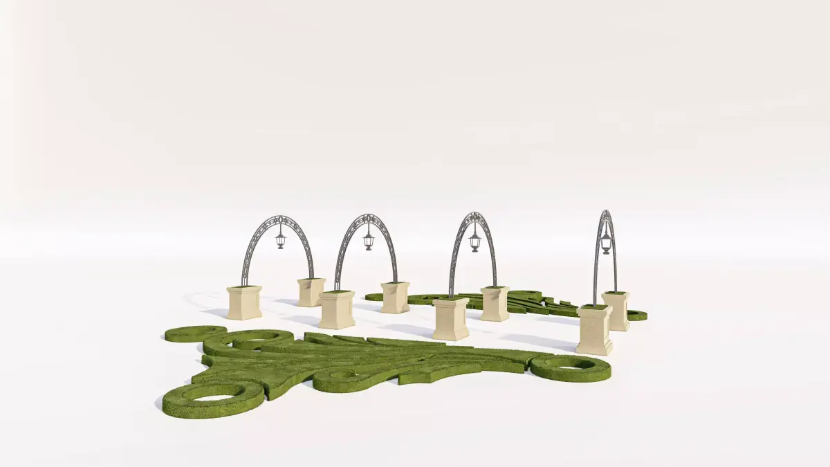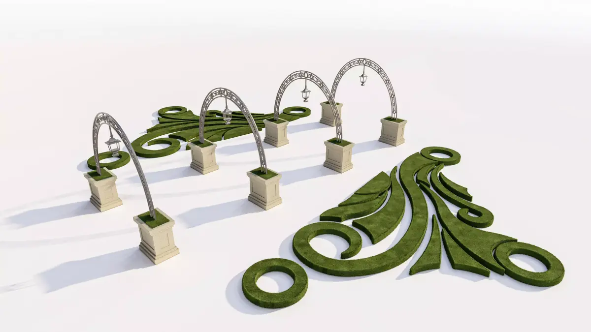 This unique 3D model presents a dramatic and elegant Garden Archway and Landscape Set, perfect for creating classical, romantic, or stylized environments in architectural visualization (Arch-Viz) of parks, formal gardens, wedding venues, or estates.
