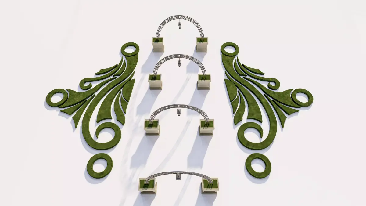 Decorative Topiary: Large, separate pieces of low-profile, sculpted greenery arranged in abstract, flourishing patterns (spirals, leaves, and scrolls). These pieces are designed to complement the structure and can be arranged modularly.