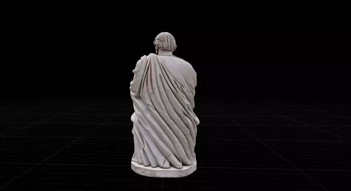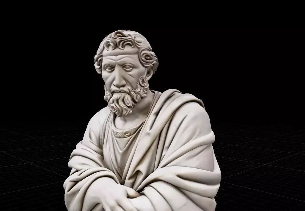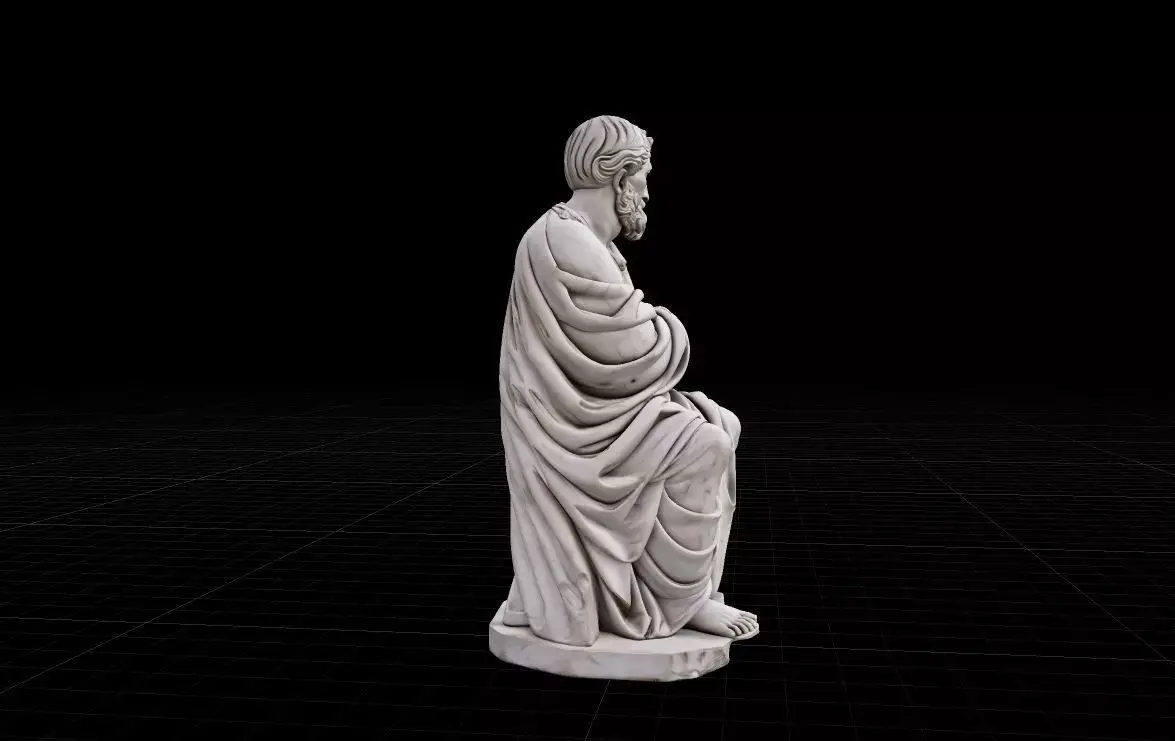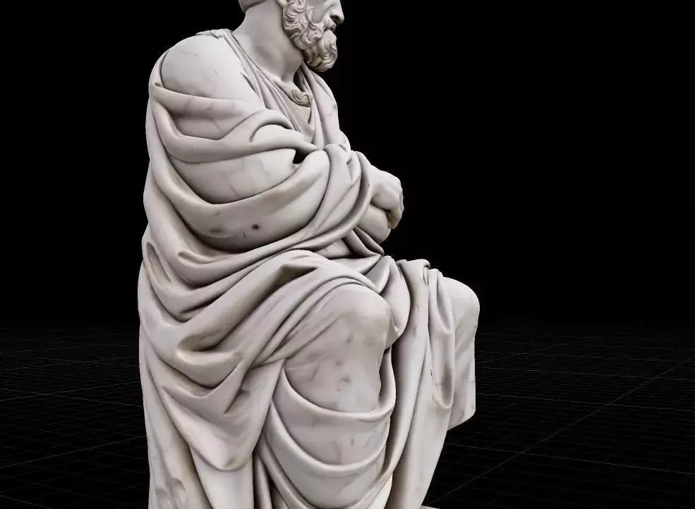 This high-fidelity 3D model features a meticulously sculpted seated philosopher in the Hellenistic style. Captured in a moment of deep contemplation, the Stoic Thinker is part of the exclusive digital asset series. With nearly 2 million faces, this model preserves every intricate fold of the toga and the weathered texture of the marble, making it ideal for close-up architectural renders, luxury interior visualizations, or 3D printing.