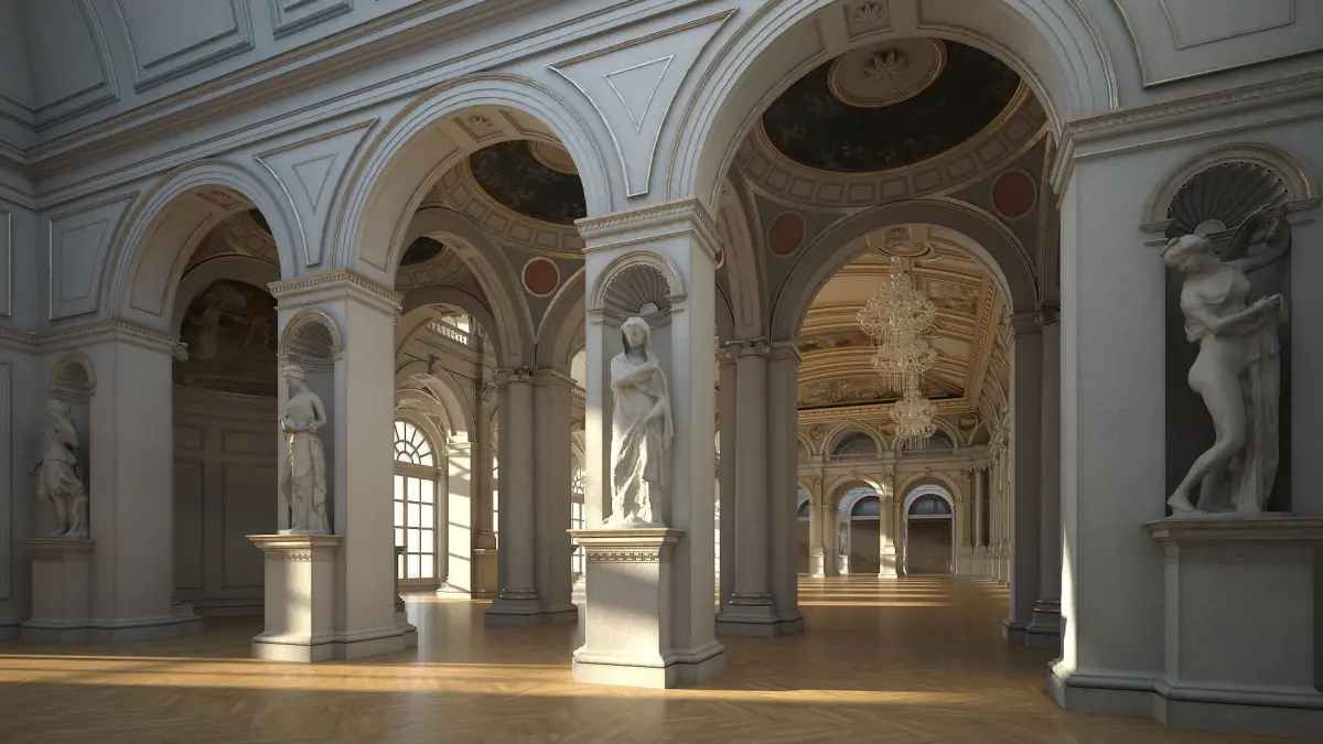 All objects have names and are organized with layers according to type of object and material. The model is composed of different objects: arches, columns, entablatures, vaults, etc. The model uses vray materials.