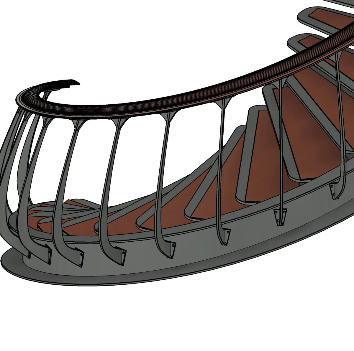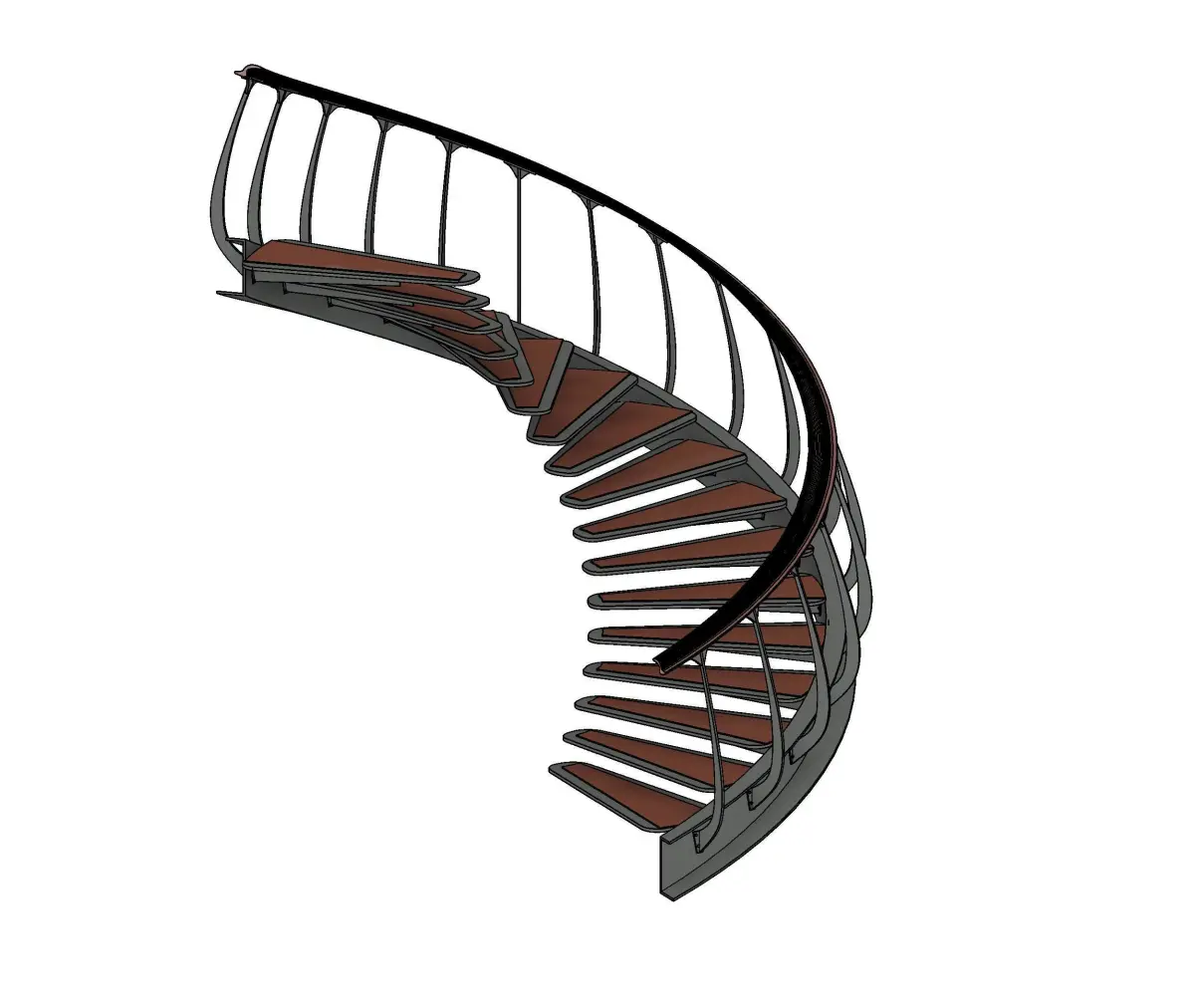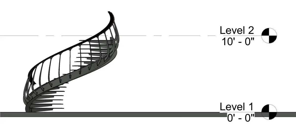 Revit modeling of a classic staircase with a metal and wood structure. The stair rises to a height of 10' (approx 3mts)
