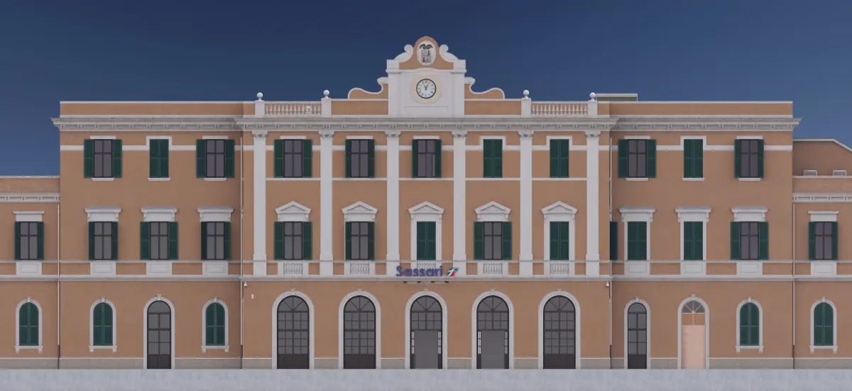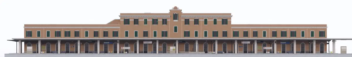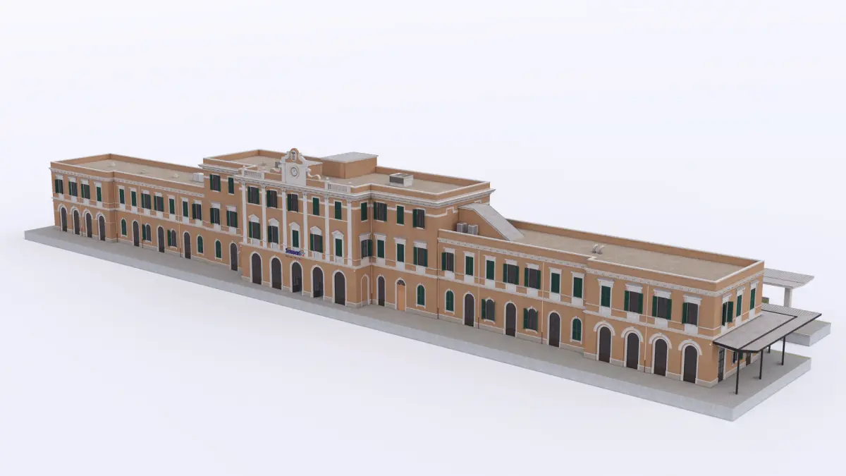 A mid-size classical style train station. In real life it's located in the 2nd largest town of the Italian island of Sardinia - Sassari. The model thus has a signage for that city and Italian Railway Company. Somewhat altered and modified but in great measure reflects the real-life object.