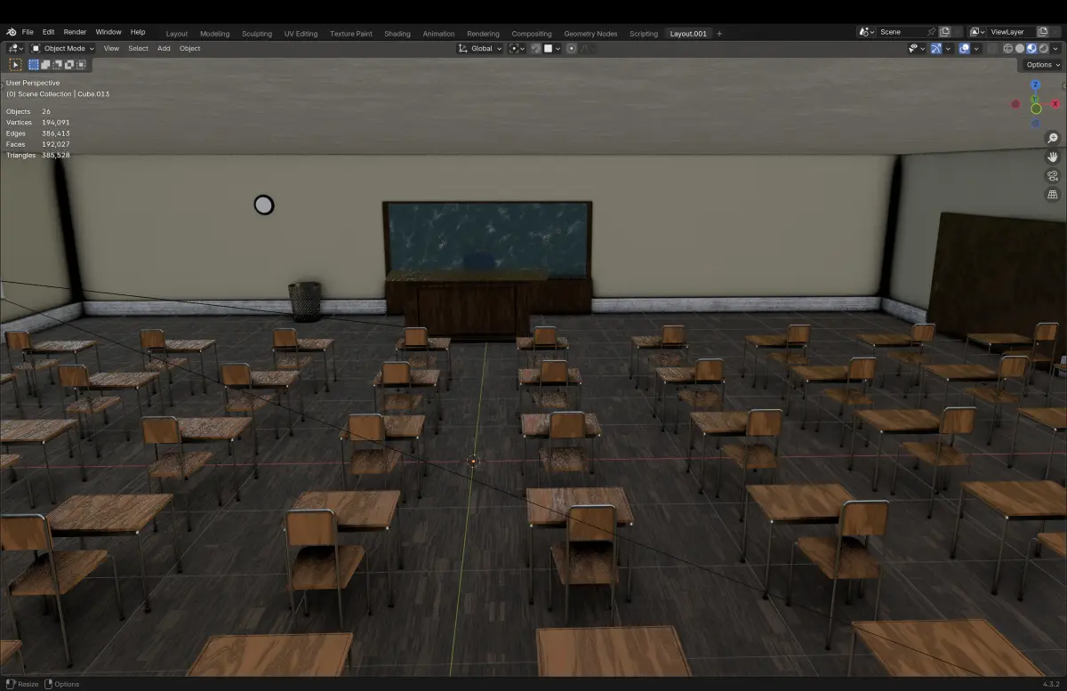 A classroom made to exact human proportions.All materials are highly realistic. They are not baked in. UV unwrapping is slightly messy from the default shapes used. Perfect for CGI/VFX and set extensions. Floor is wood, ceiling is tile, walls are plaster, baseboard is concrete, door is wood, clock is metal, trashcan is metal, teacher desk is wood, teacher chair is cloth and steel, and student desks and chairs are pale wood and steel.This was modelled off of several photographs of several classrooms in Tokyo.The sunrays through the windows are created using two sky textures with no low air and two sun lights. Move the sun lights and the sky texture angles together to move the lighting. The yellow dust rays are created using a cube encompassing the set. The density is set to .06 percent. Color is set to zero. For more dust increase the percent and vice versa for less.The clock has no actula numbers. If you have any questions or projects you want done, feel free to contact me.