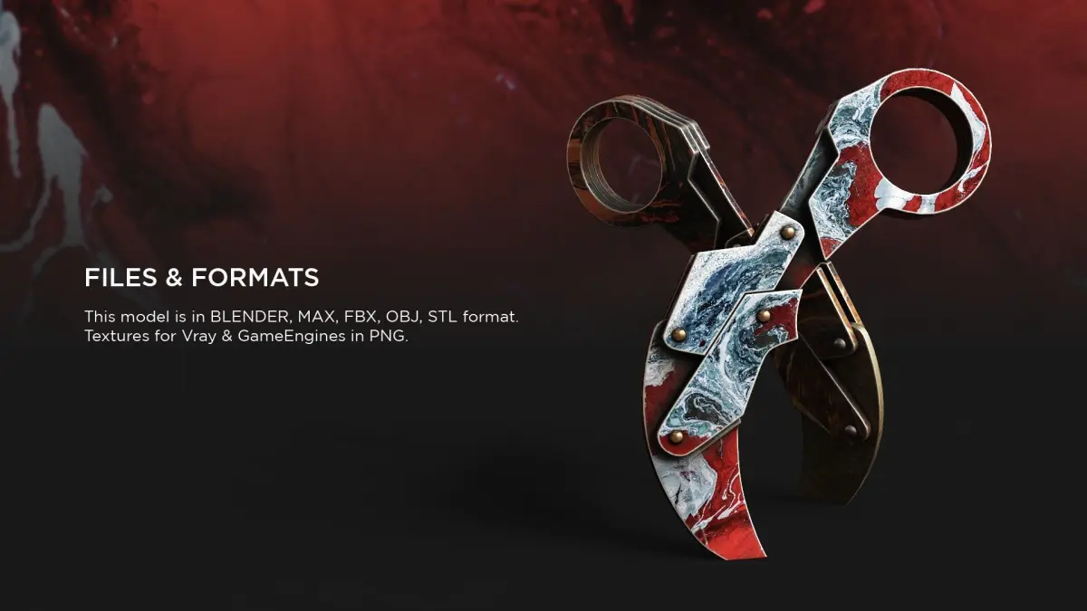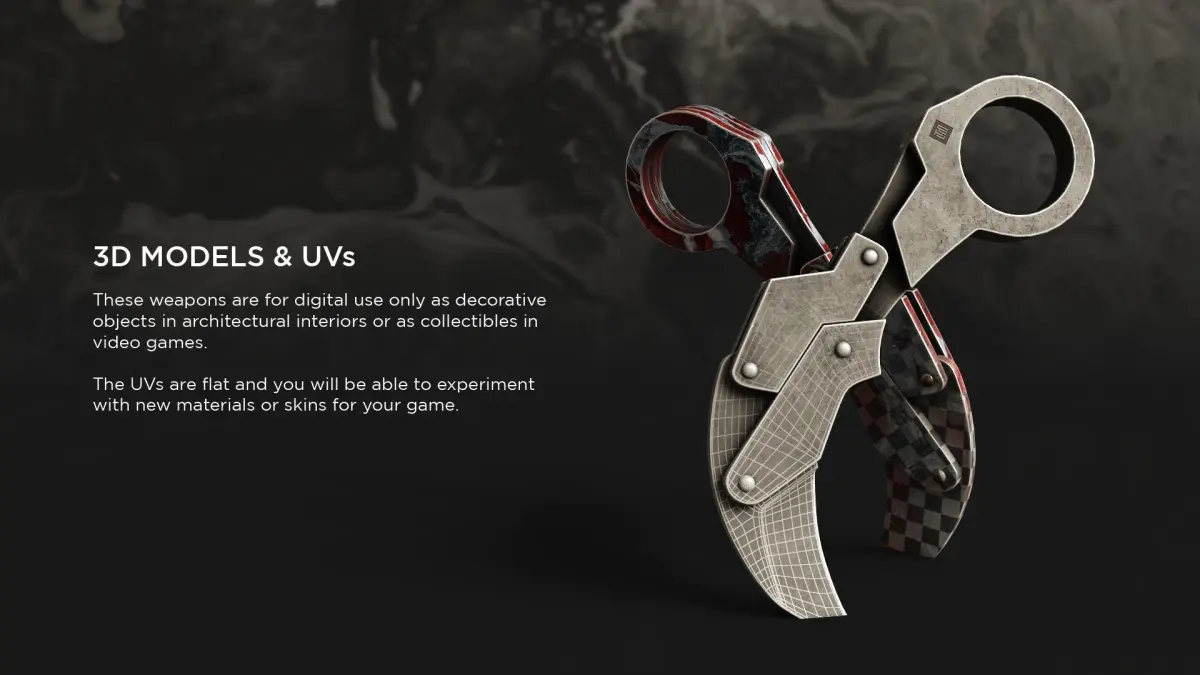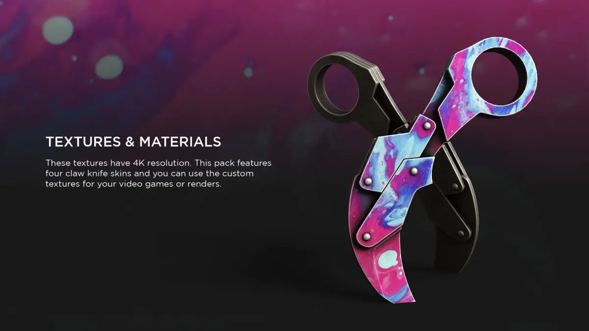 Fantastic tactical knife. This knife has four customizable skins depending on its use. It is intended to be used as a decorative object in rendered scenarios, although you can also use them for your video game projects.