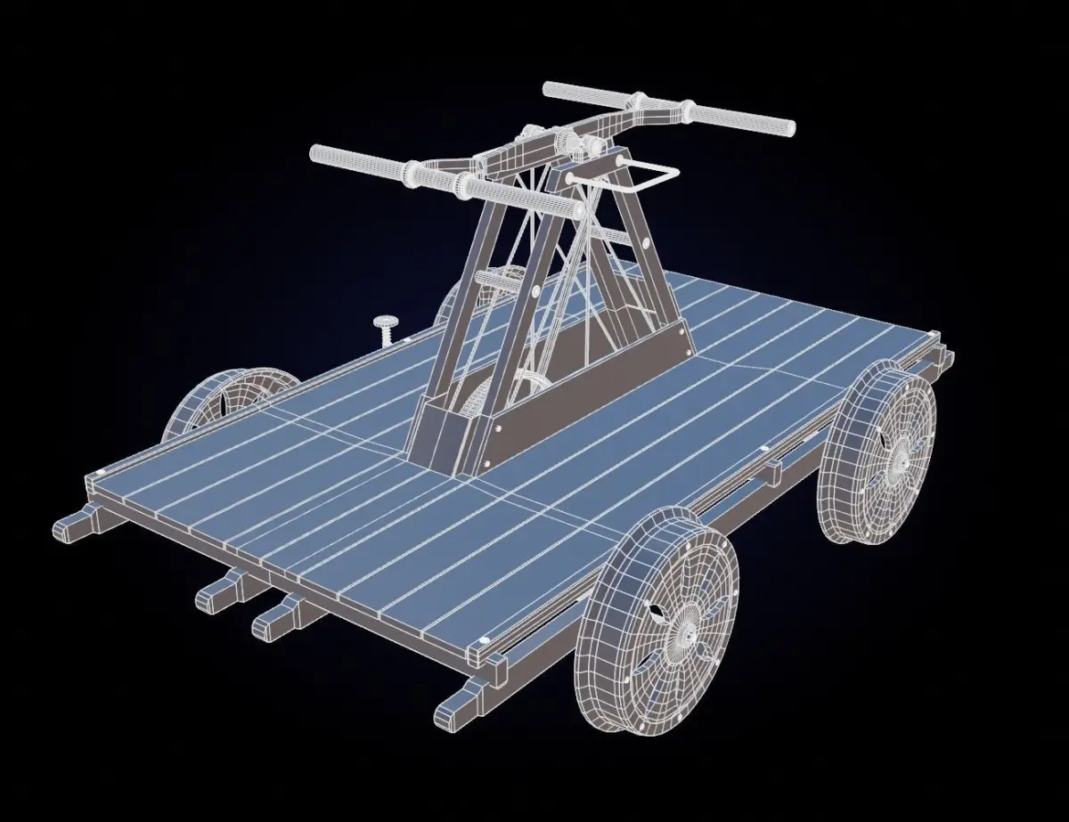 - Consists of separated objects parented to cart object. Some objects (the wheels, per example) are instanced copies.
