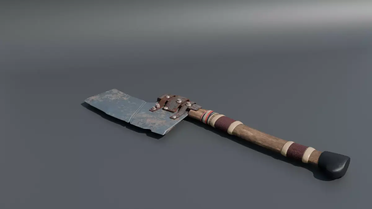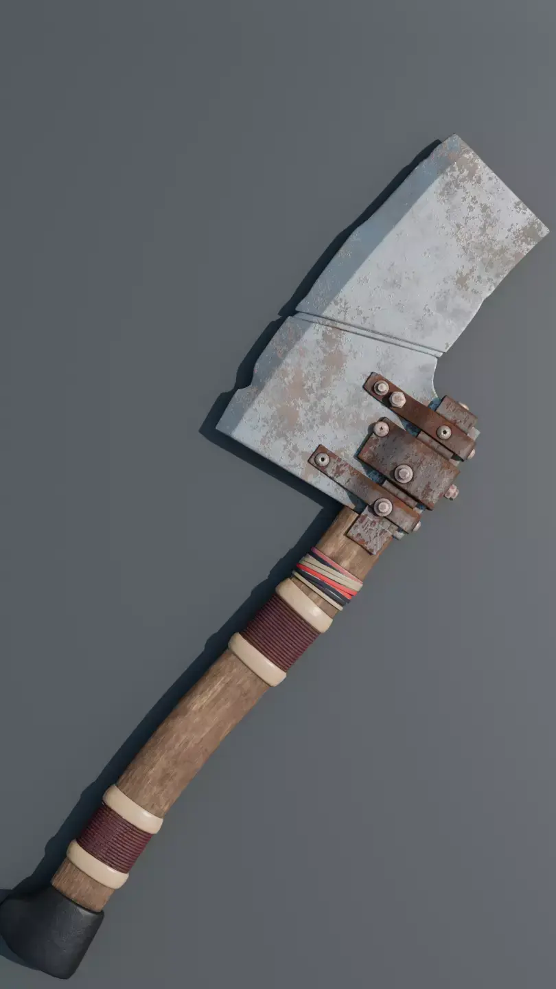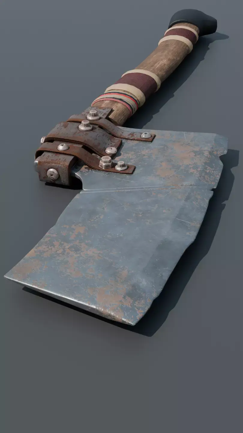 A rugged improvised hatchet built from a cleaver-style metal blade and a worn wooden handle, reinforced with bolts/plates and wrapped grip details. Perfect for post-apocalyptic, survival, zombie, or scavenger scenes as a melee prop, tool, or environmental set dressing.