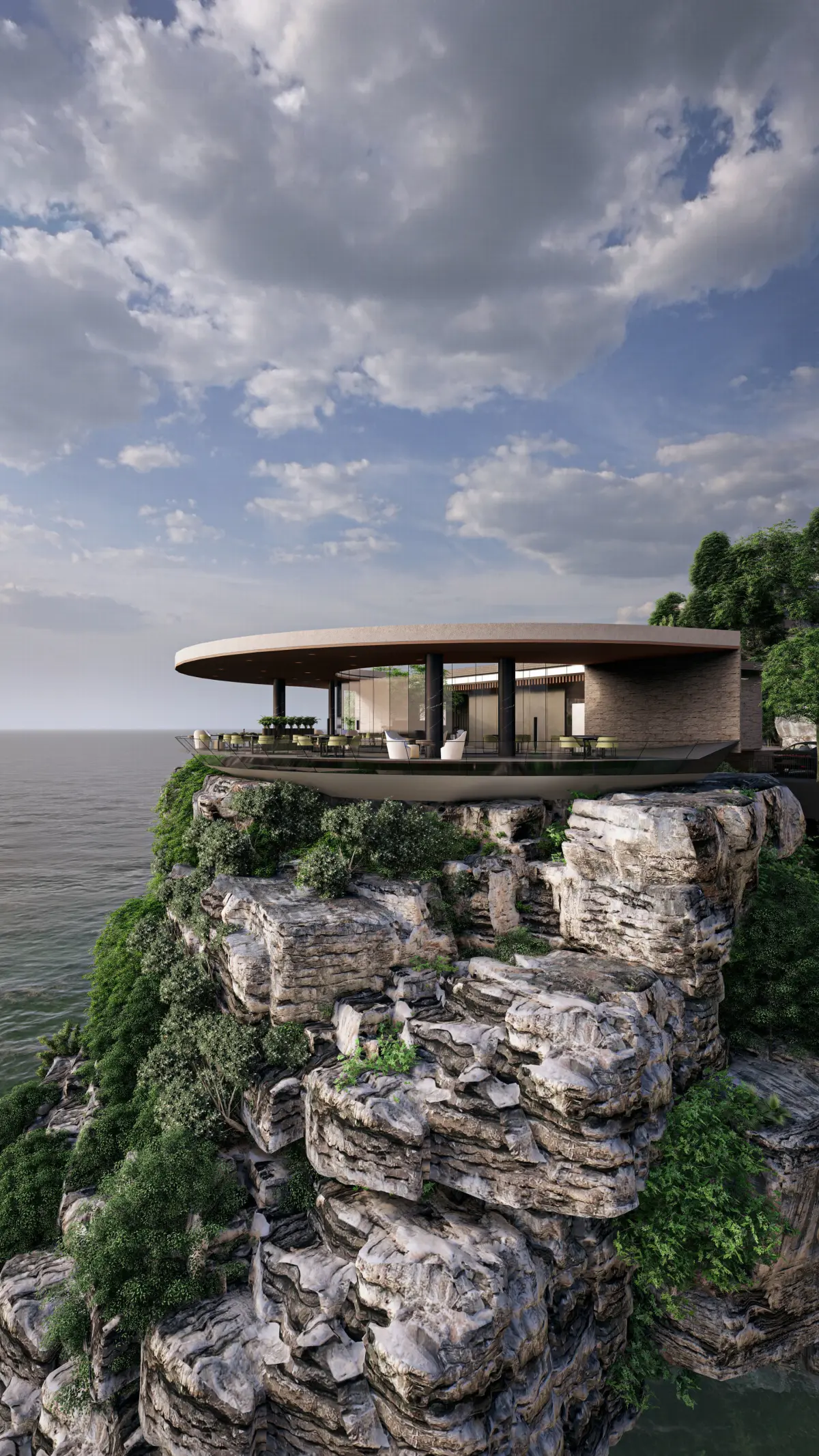 Cliffside structure with realistic rock and vegetation.Modern facade with wood, stone, and glass materials.Outdoor terrace with seating and panoramic ocean views.Interior Design: