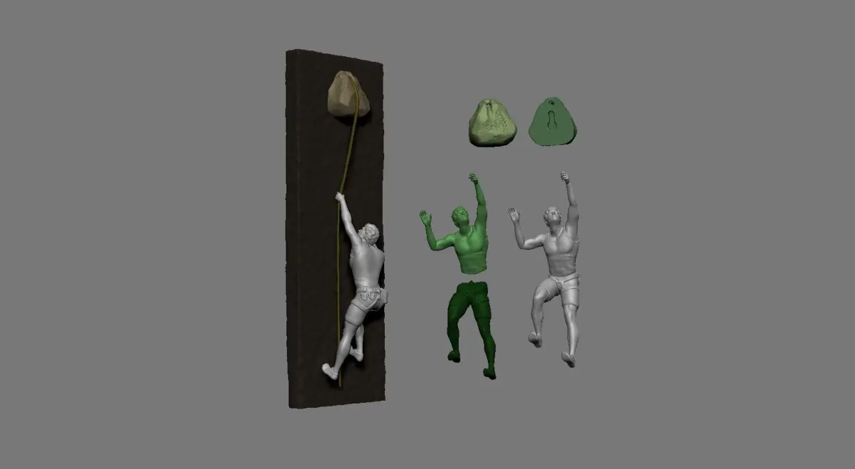 The model has 2 parts, on the one hand the body of the climber and on the other hand the holding stone that has a hole to insert the rope and a socket to hold it to the wall with a fixation.