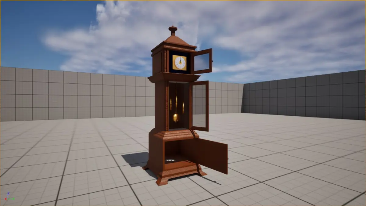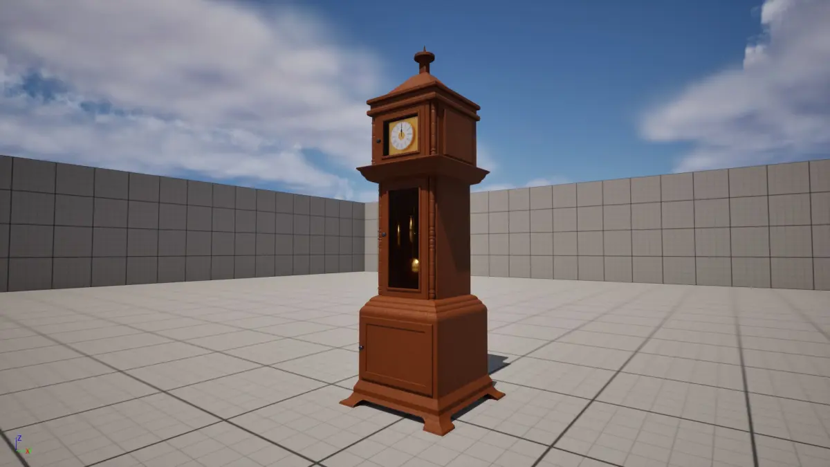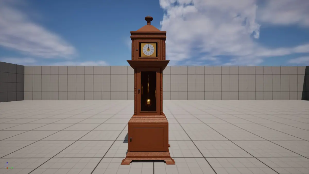 This clock system has a simple blueprint that shows the real time on the Grandfather clock, created in Unreal engine 5.3.2.