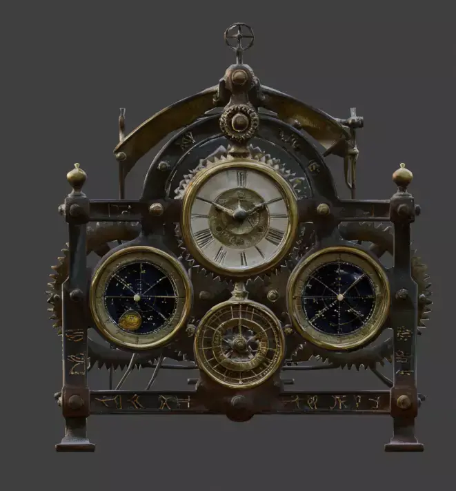 Clockwork Astral Clock 3D ModelDescriptionA highly complex 3D model of an antiquated Clockwork Astral Clock, featuring a sophisticated mechanical core housed within a rugged, weathered iron frame.