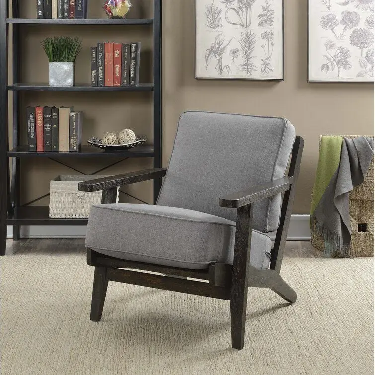 - - 14. - Lend that lovely lived-in look of modern farmhouse decor to your bedroom or living room look with this stylishly rustic armchair! Crafted from Chinese oak, the frame boasts a solid neutral finish for a look that’s versatile enough to blend with nearly any colour palette! Plus, it features two removable cushions upholstered with 100% polyester in a solid colouring for added comfort and an additional layer of colour. Measures 34' ' H x 29' ' W x 38' ' D.