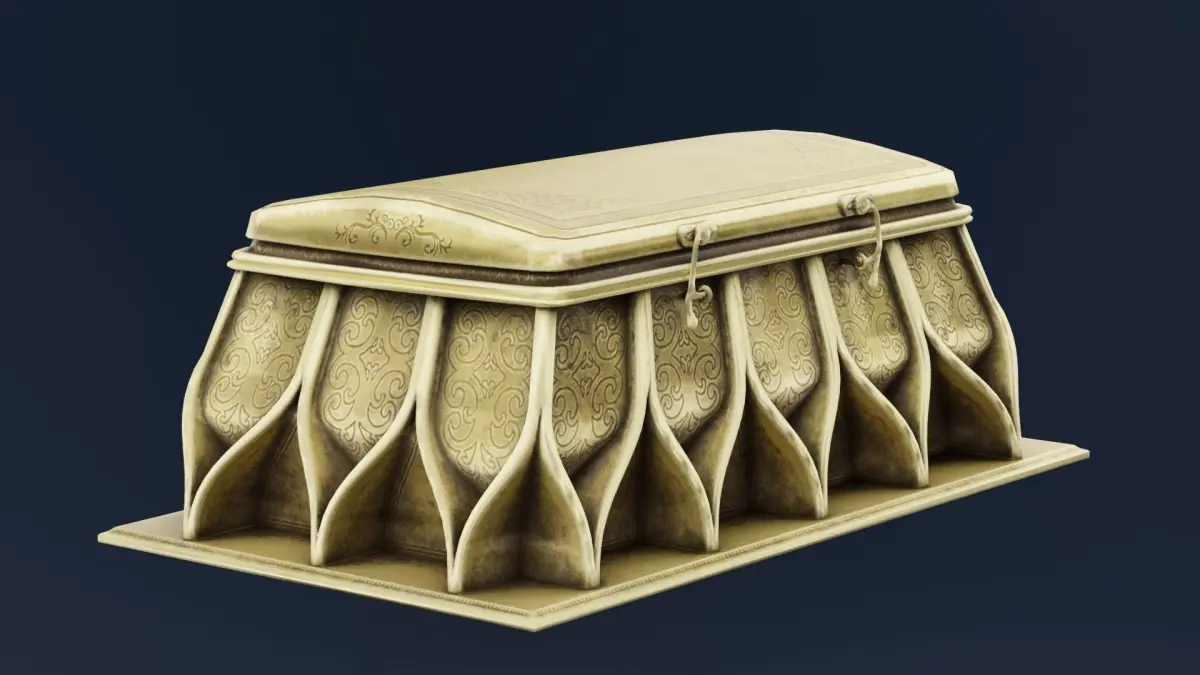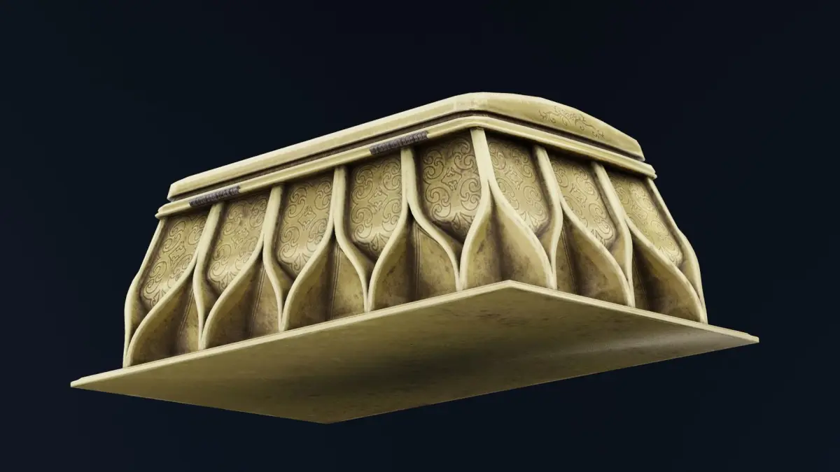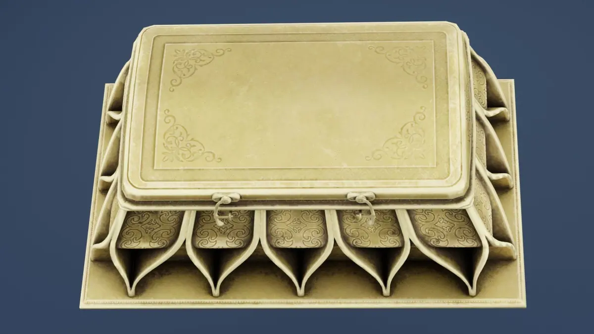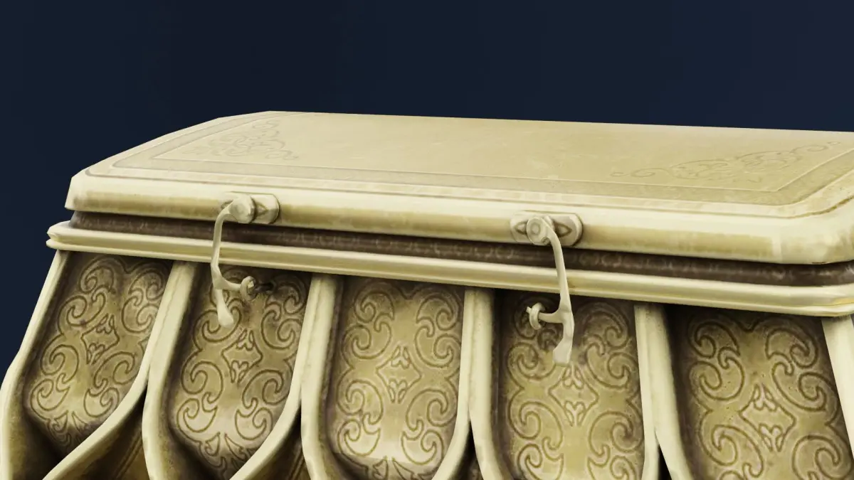 Closed Treasure Box 3D ModelA beautifully crafted Closed Treasure Box with a rectangular wooden structure reinforced by ornate metal bands and corner protectors. The lid is adorned with intricate carvings, rivets, and a central decorative latch, giving it a secure and mysterious appearance. Rendered with 4K textures, the box showcases realistic wood grain, aged metal details, and subtle wear marks, enhancing its authenticity. Available in Blend, FBX, OBJ, and DUF formats, this model is perfect for treasure hoards, medieval settings, or fantasy-themed 3D environments