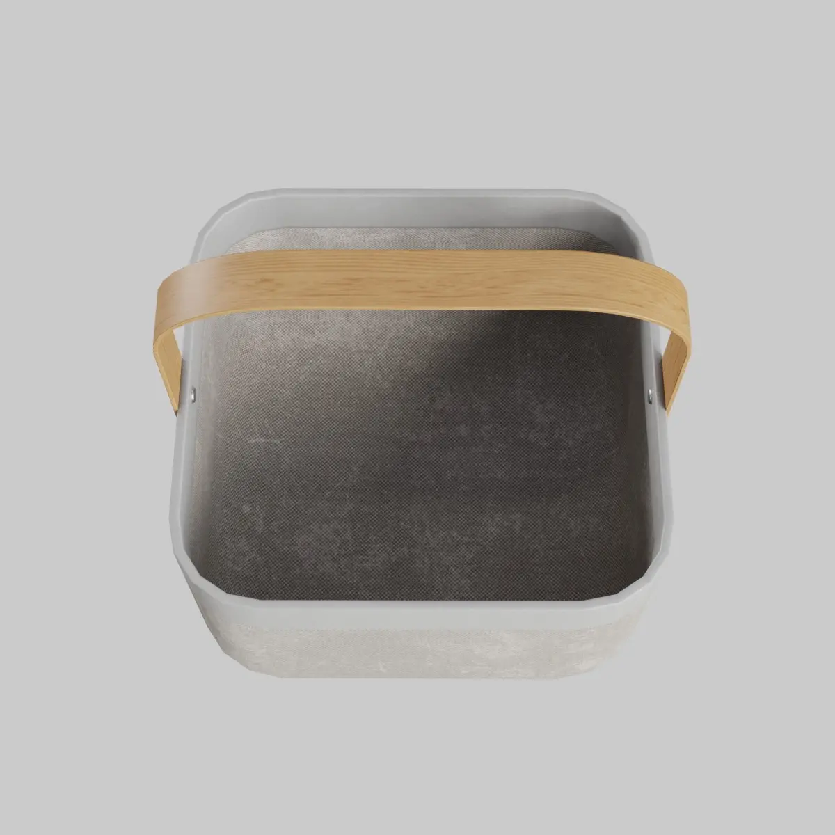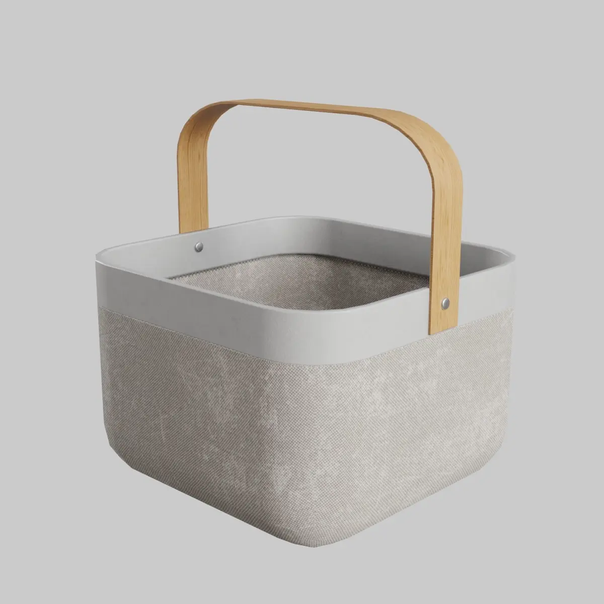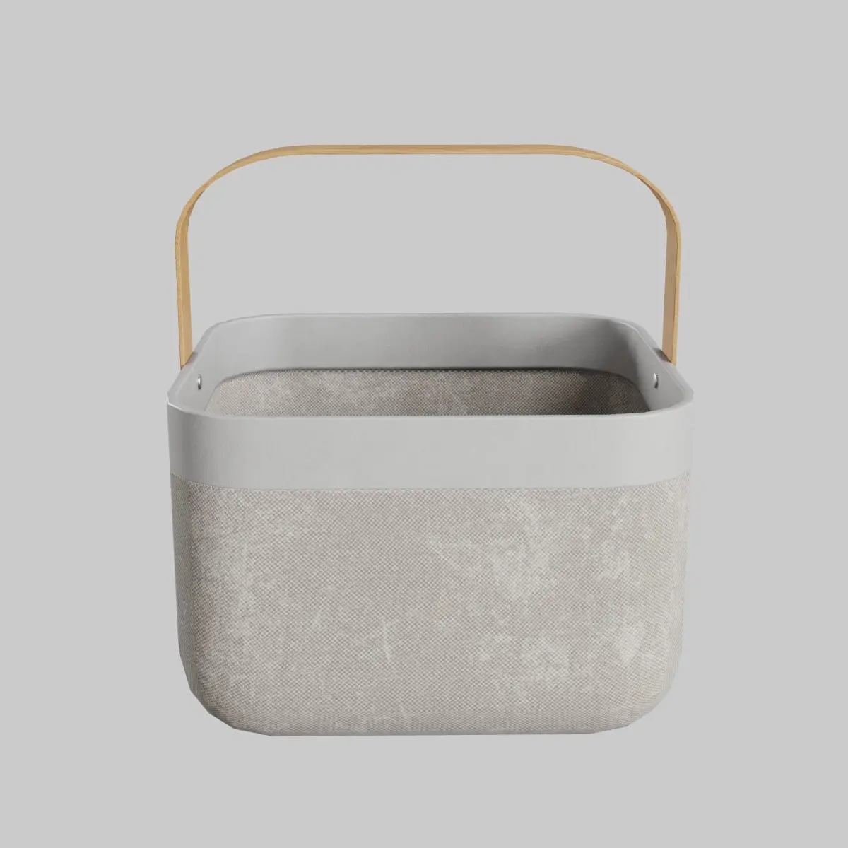 cloth basket with wooden handle and plastic mounting frame secured with screw.