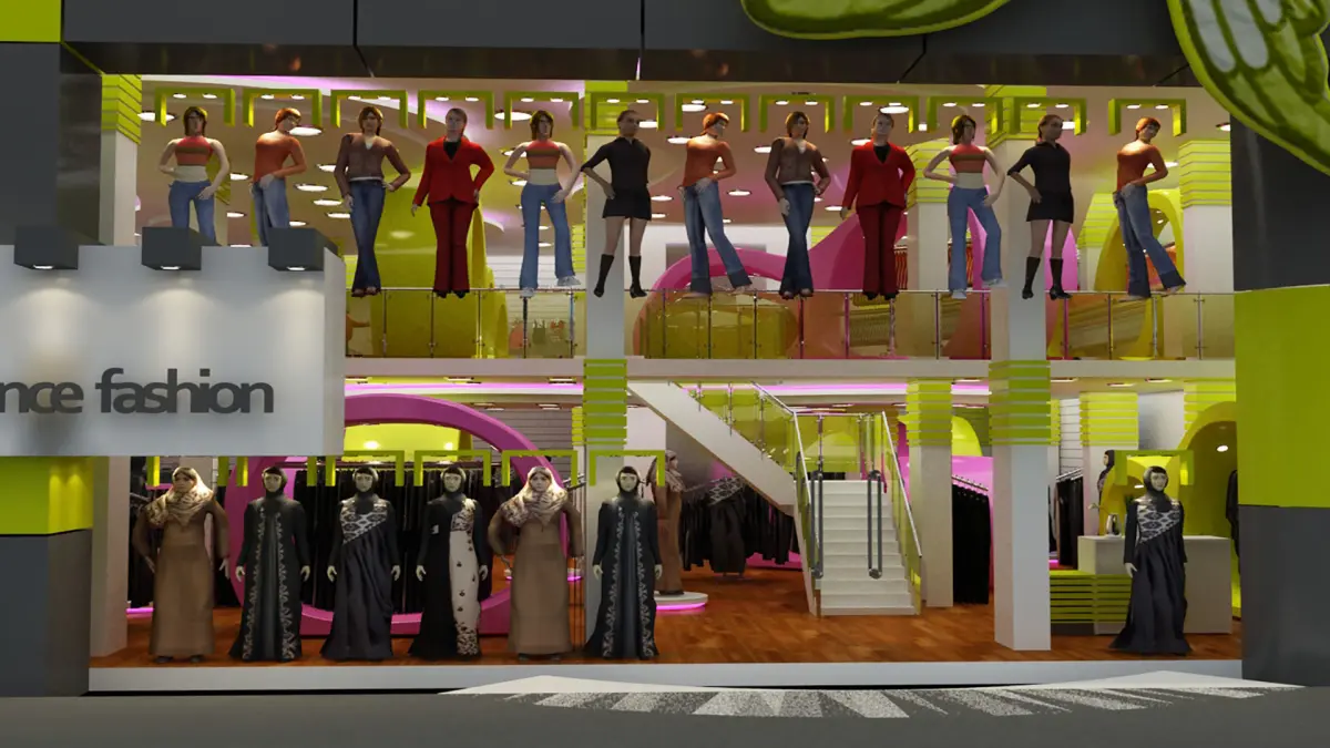 Cloths store Mall Center with highly detailed, photorealistic 3d models set of female Cloths with mannequin, clothing stands and mannequins.