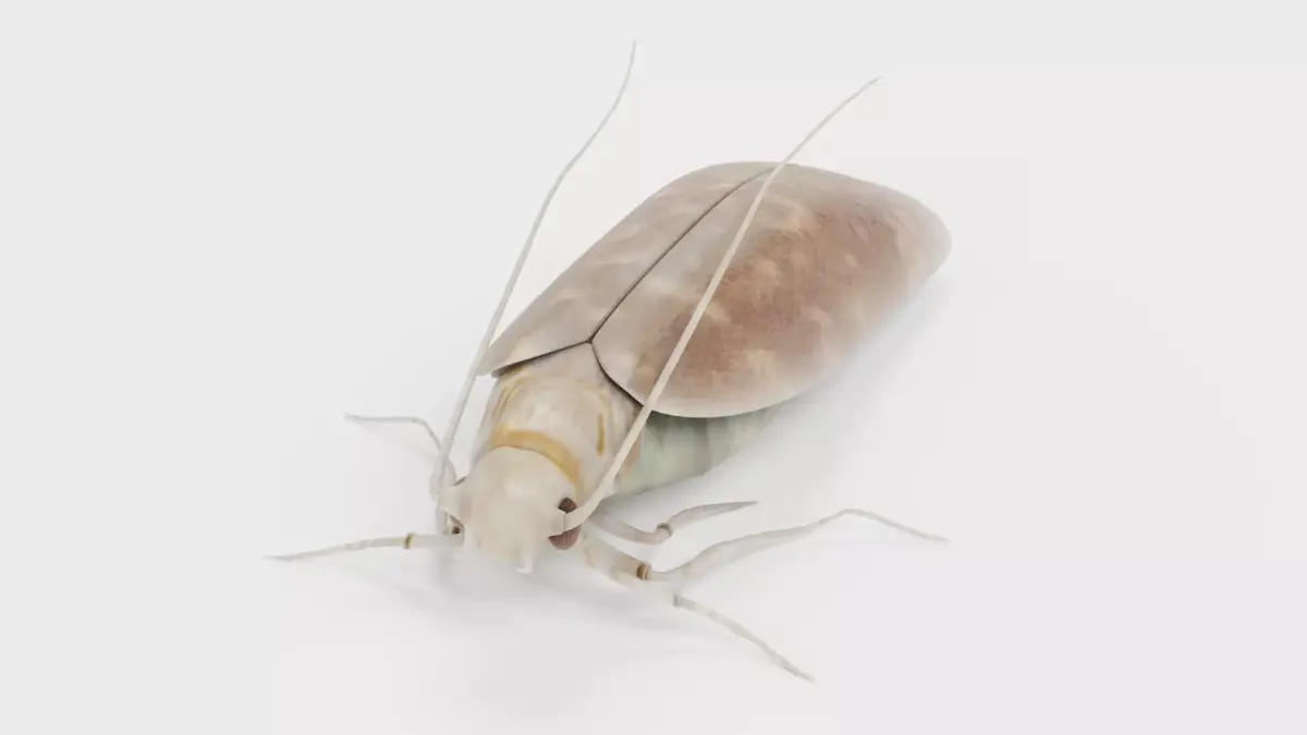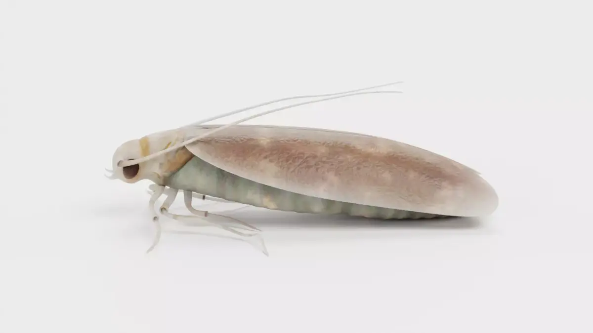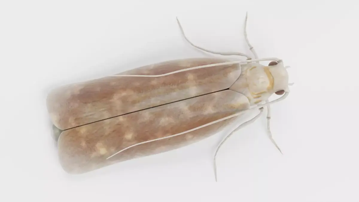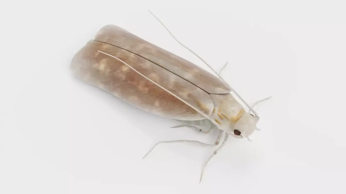 A realistic 3D model of a cloth moth (Tineola bisselliella), accurately representing the anatomy and surface structure of this small household insect. The model features pale, slightly reflective wings, a slender segmented body, and detailed antennae and legs, achieving a believable balance between realism and stylization.