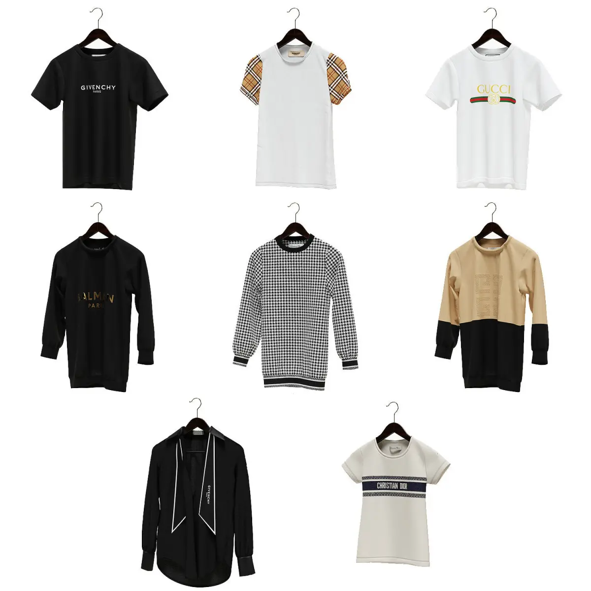 Clothing set containing 8 pieces of clothing on hangers. Perfect for interior renders, wardrobe and closed visualizations, boutiques, shopping malls, stores or just as fashionable details in any scene you need them.
