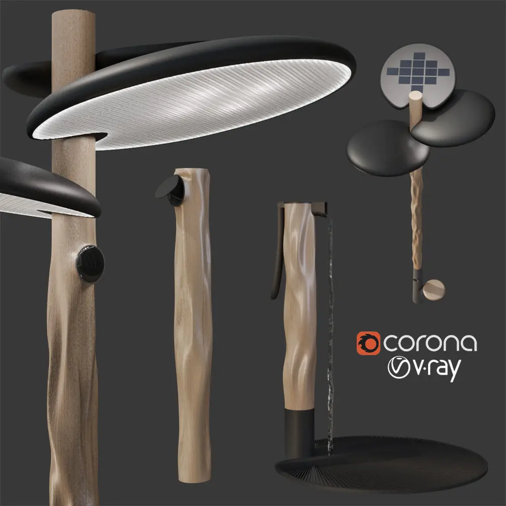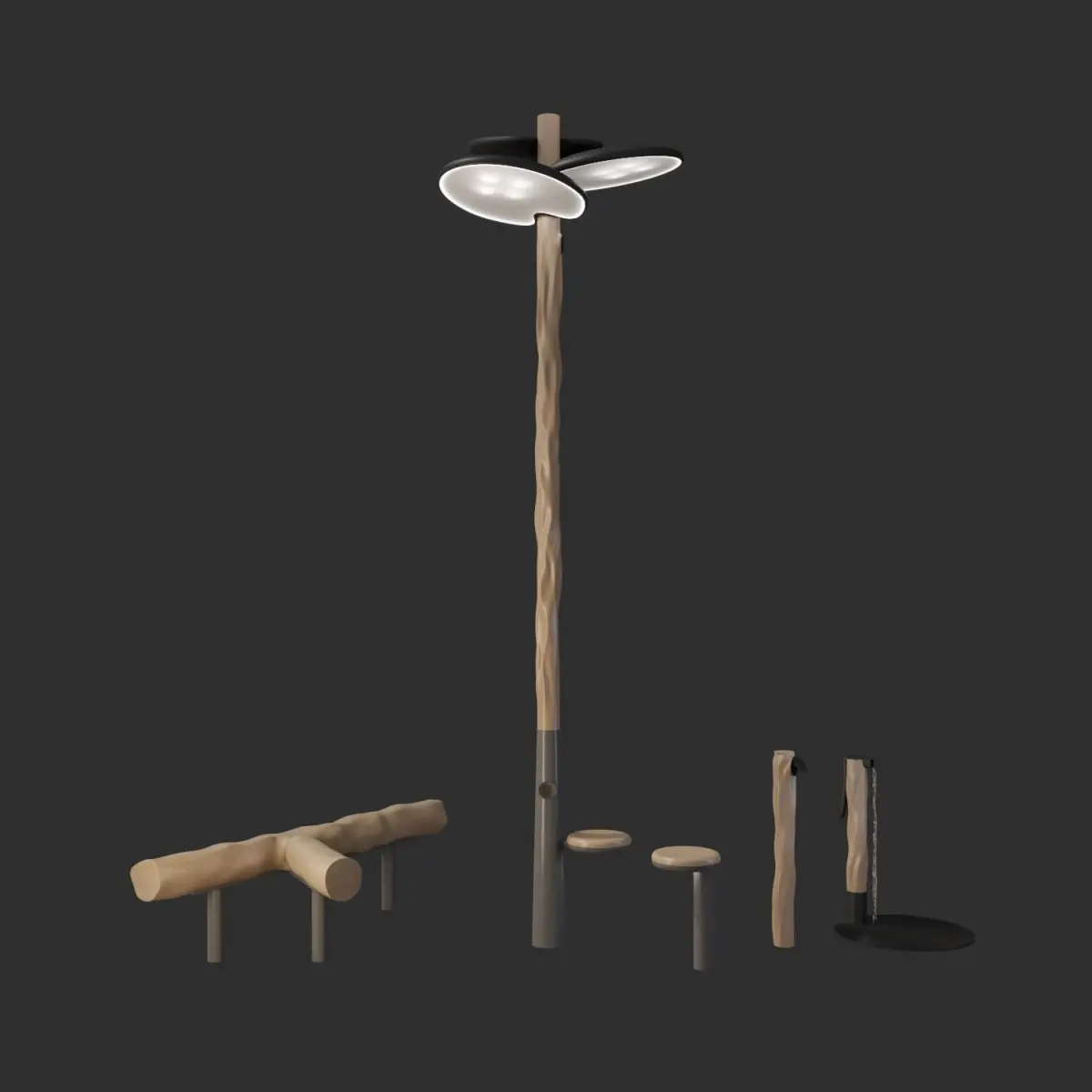 Clover are trees who mix energy, functions and materials. Hybrid objects parexcellence, combining light and seating, wood and solar panels, town and country.Designed from a carved wooden mast, floor lamp and bench seem cut and polished by the hands of a craftsman. They are in fact digitally machined according to an unprecedented industrial process allowing the use of many different wood species as the implantation region. From the same software and manufacturing process, a local wood supply is possible as if replanted a tree that always should have been there.At the top, fixed large aluminum domes distribute light by their LED exclusively directed downward to keep maximum light pollution of cities and energy loss. Another dome, faced upwards, is provided with solar panels that allow 3-hour-autonomy from solar energy. Important detail: a small hatch at hand will give access to a self-service charge for your smartphone.Finally, thought to multiple settings and configurations, « Clover » elements adapt themselves in height and length to spaces that host them. The bench can reach over 15 meters long as necessary ...I always dreamed of a long bench as a landscape ... at the landscape scale. This project was installed on the occasion of COP21 - United Nations Conference on Climate Change in Paris, 2015.This project was initiated and sponsored by the Poitou-Charentes french region under the leadership of its President Segolene Royal (currently France Minister for Ecology, Sustainable Development and Energy).