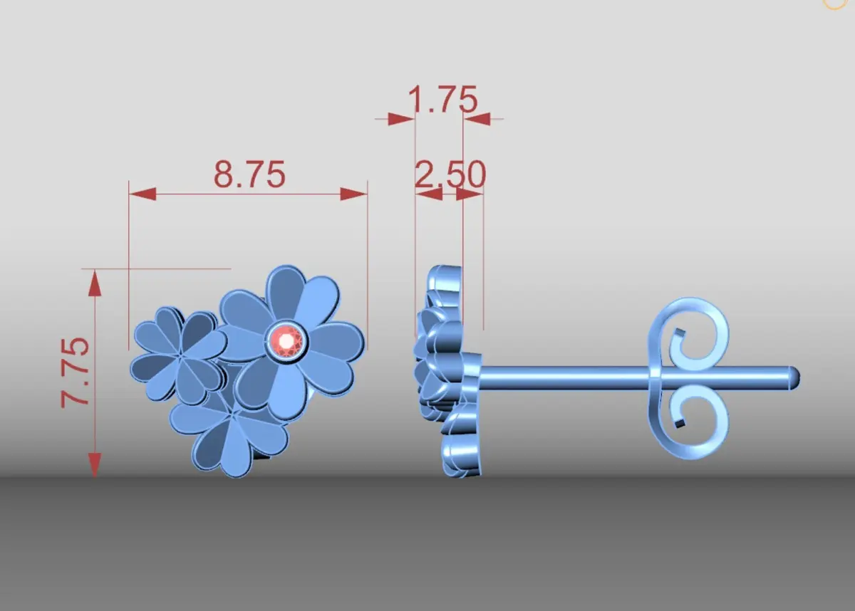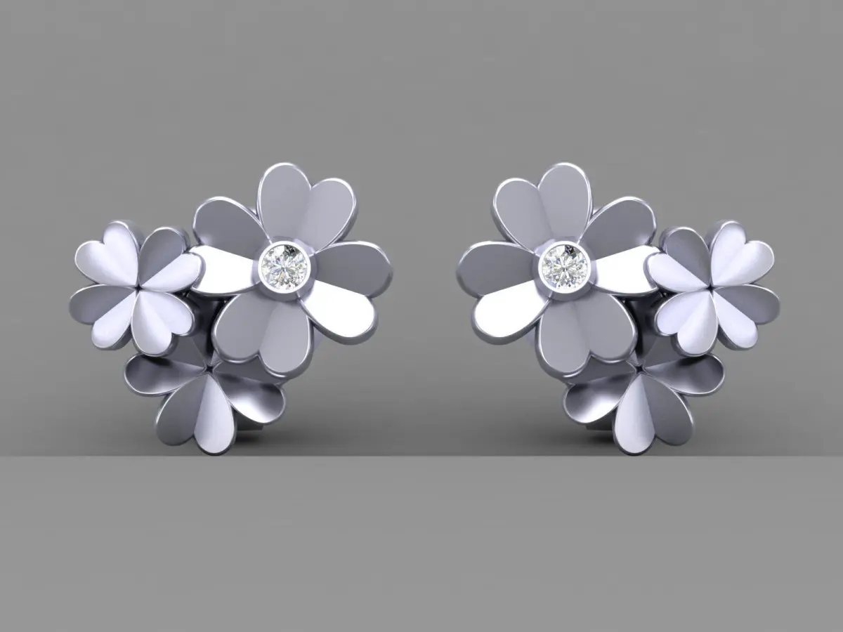 Cluster Four Leaf Clover Stud Earrings 3D Model Print DesignThe earrings are shaped like flowers, with each petal crafted in a sleek, metallic finish, likely silver or platinum.At the center of the larger flower is a sparkling gemstone, possibly a diamond or cubic zirconia, adding a touch of luxury and brilliance to the design.The flowers are layered, creating a sense of depth and dimension.