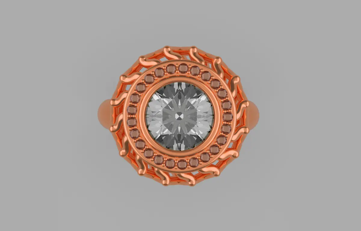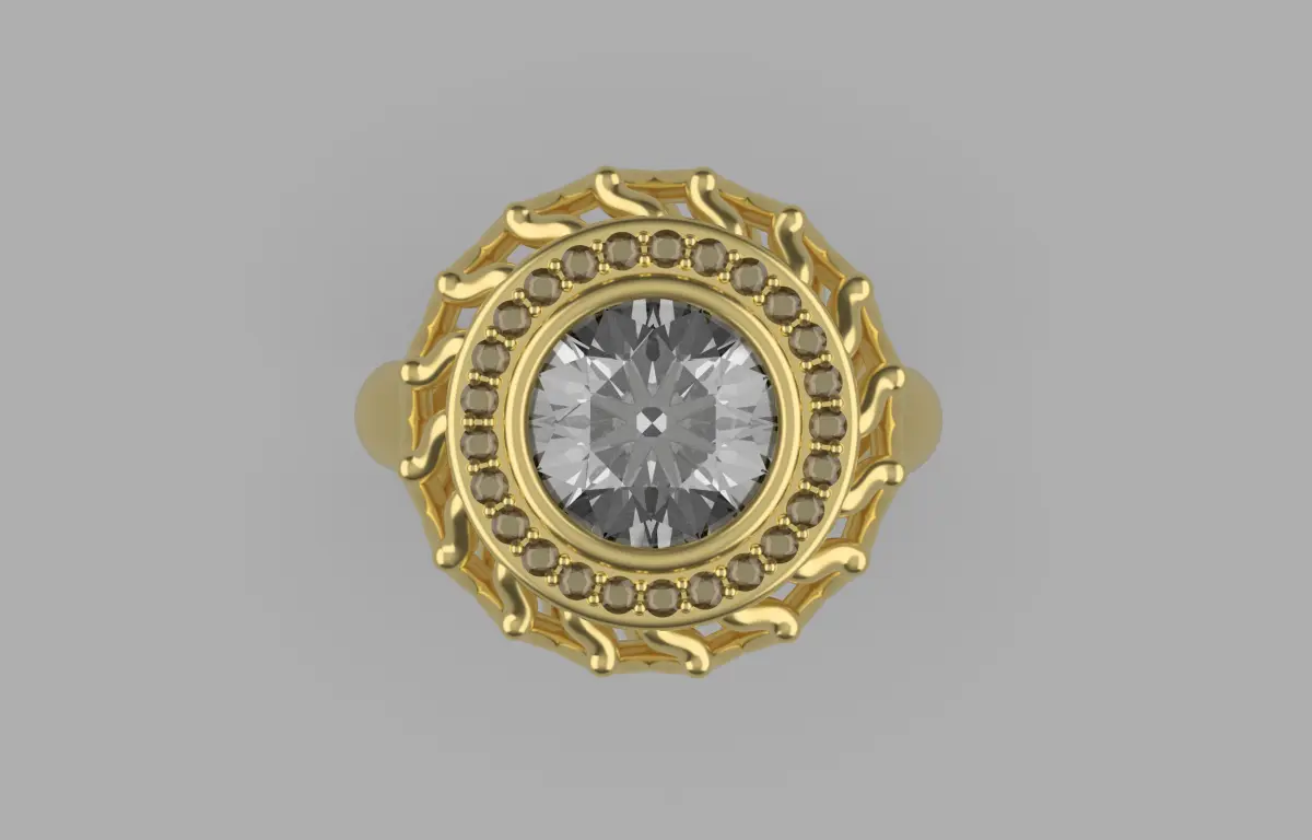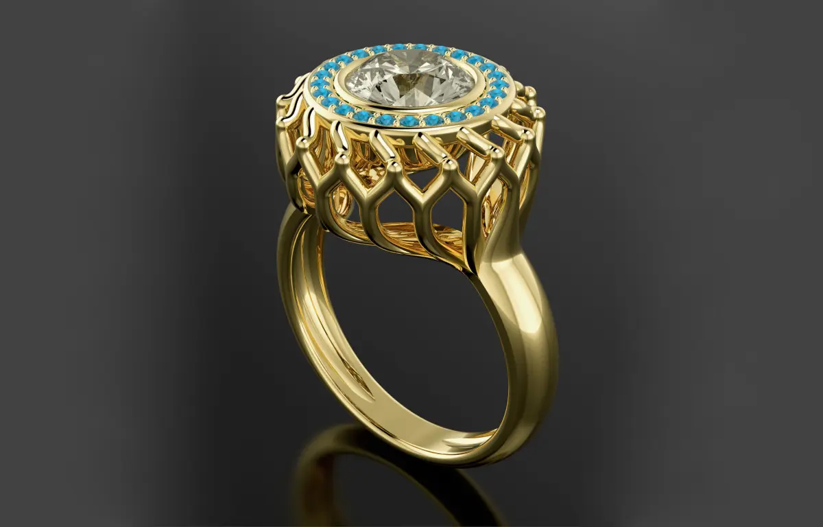 This elegant ring design draws inspiration from the structure of woven golden basket,beautifully embracing a large central gem stone.The outer halo is adorned with avivid row of small blue stones,adding a striking contrast to the warm golden tones. Features: