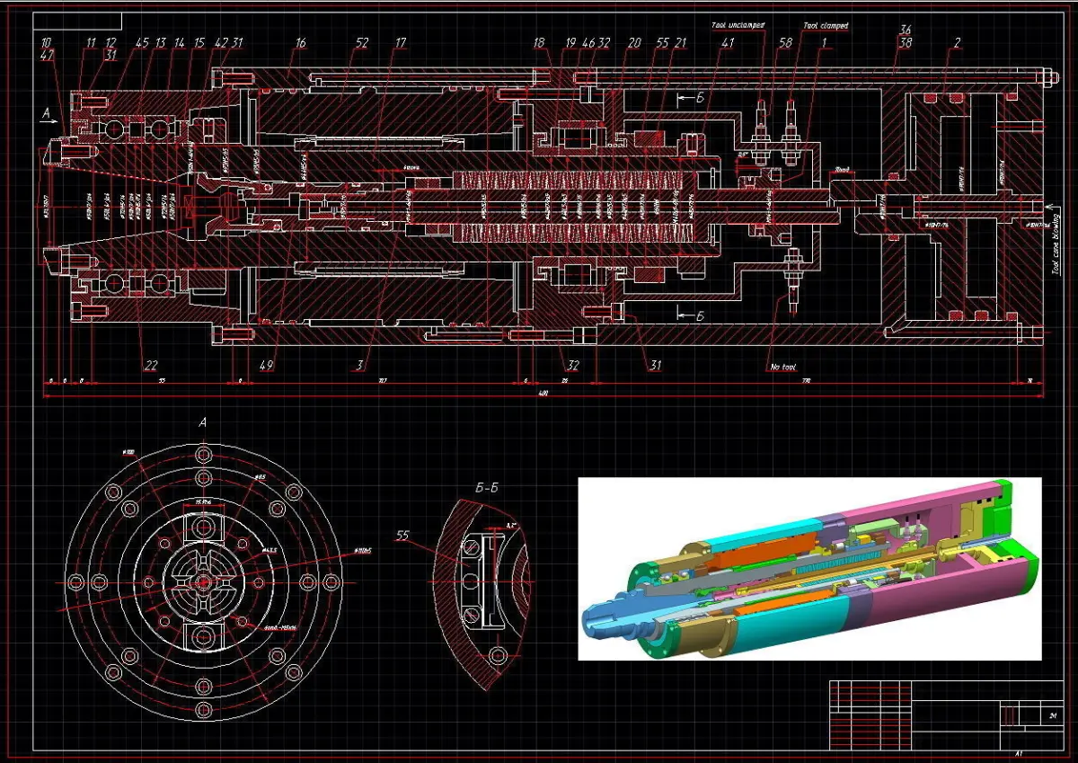 CNC motorized spindle for machining plastic parts consists of an adjustable AC motor, spindle headstock with spindle assembly, tool clamping mechanism, angular position sensor etc.