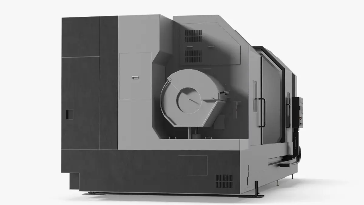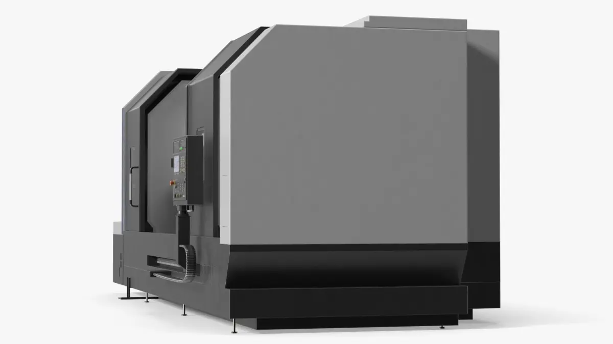 This model showcases the intricate details of a high-performance lathe, featuring a robust spindle, adjustable tool post, and advanced computerized control panel for precise operations. The enclosed design ensures safety while maintaining optimal functionality in metal fabrication.