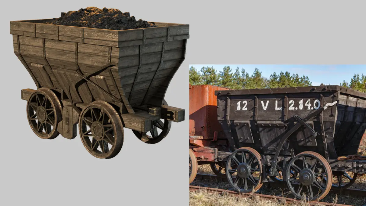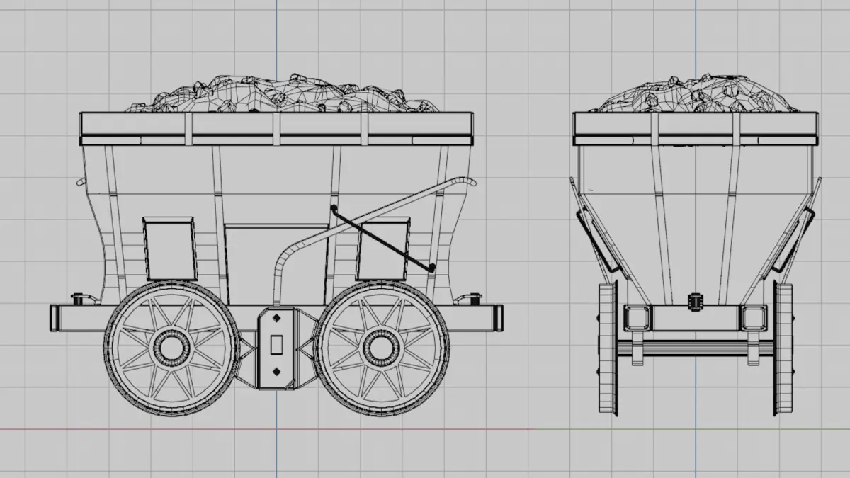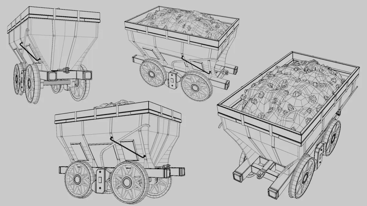 A mid-level detail coal mine cart based on the chaldron wagons used in Britain in the 19th century. Different parts are modelled separately, the mesh is not rigged, there is a separate coal mesh with the wagon interior kept intact, pretty basic 4K PBR materials.