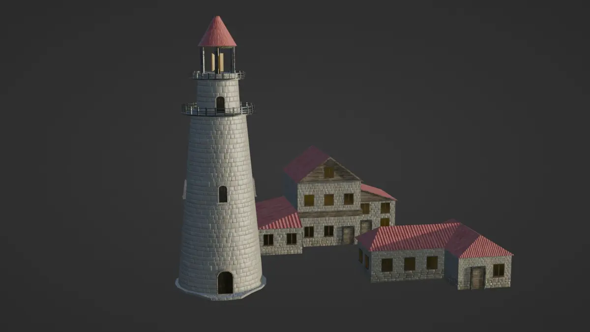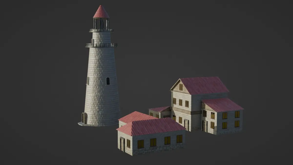 Technical DetailsProperty ValueTotal Objects 6 (Lighthouse, 3 Houses, Roof, Light Tool)Vertices 3,168Faces 3,179Triangles 5,912Texture Resolution 4096×4096 (4K) JPEGUV Layout Single Atlas, non-overlappingMaterials PBR (Metallic-Roughness)Scale Real-world units (Metric)Origin Points Centered per building