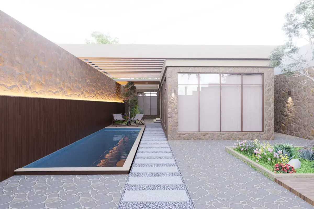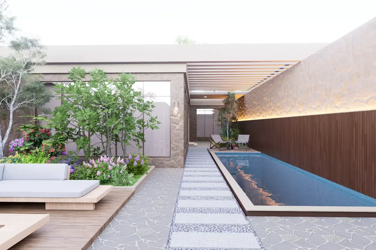 A contemporary coastal resort courtyard inspired by seaside architecture, blending natural stone, exposed concrete, and warm wood finishes to create a calm and refined atmosphere. A linear pedestrian path runs alongside a reflective water feature, enhancing tranquility and privacy. Subtle indirect lighting highlights the material textures and adds a sophisticated evening character. The design establishes a seamless connection between indoor and outdoor spaces, offering a balanced experience of simplicity, comfort, and understated luxury.