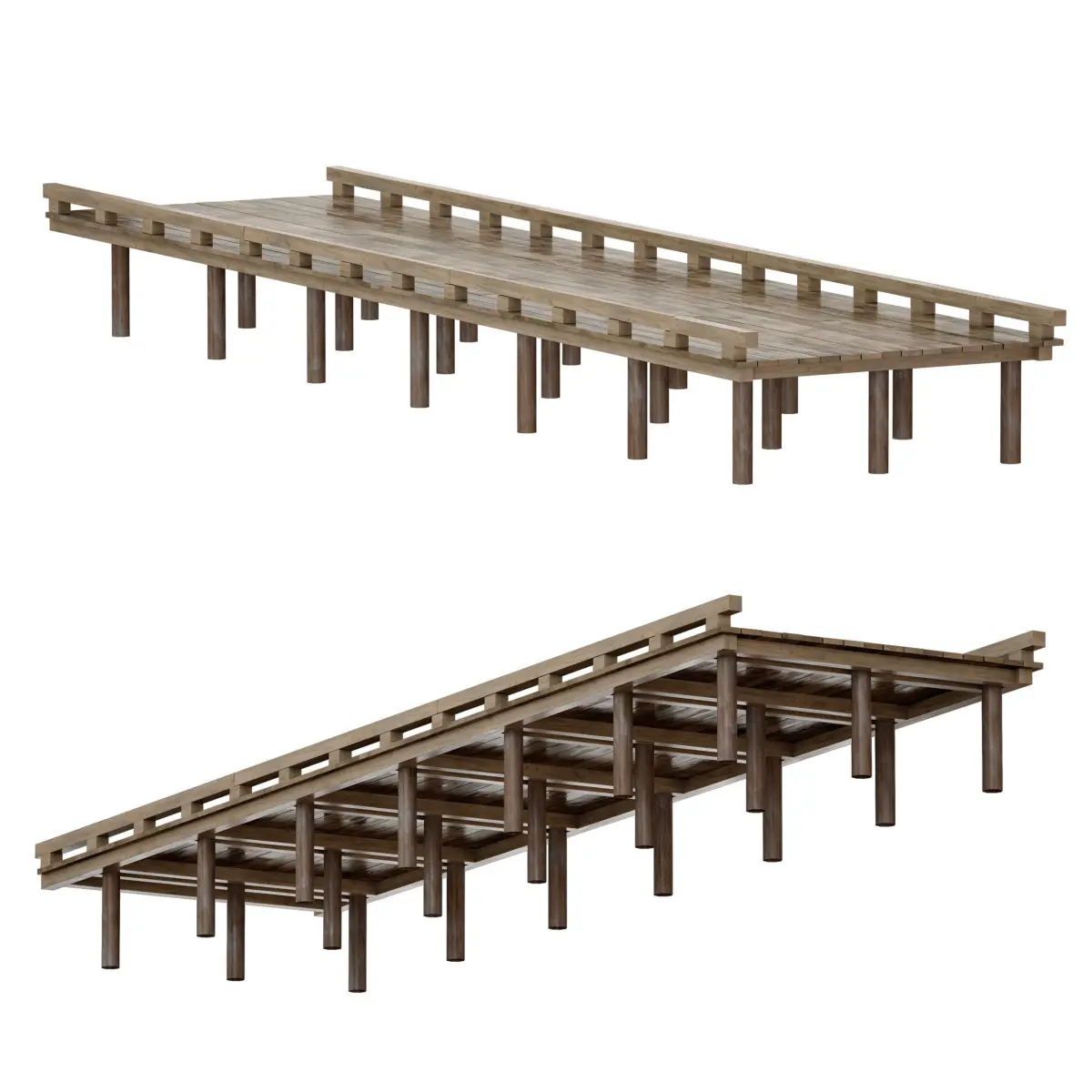 Coastal, coastal sea (river) mooring. Assembled from massive boards and beams mounted on log poles. The material imitates a wet surface.